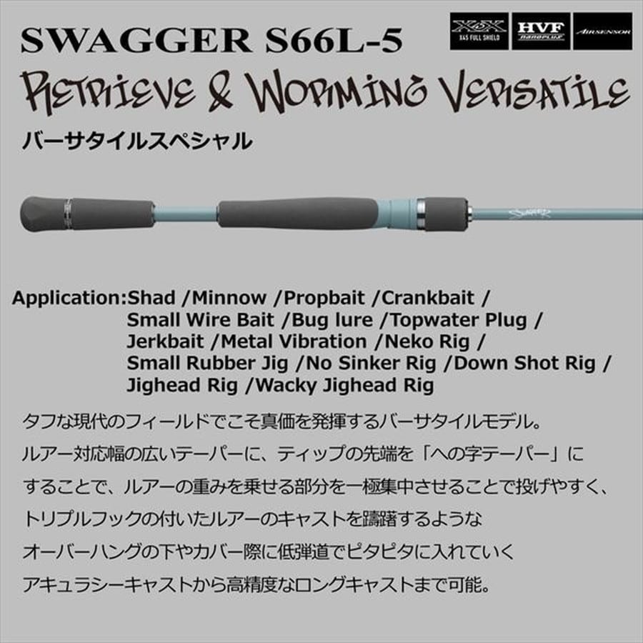 S66L-5は、タフな現代のフィールドでこそ真価を発揮するバーサタイルモデル。ルアー対応幅の広いテーパーに、ティップの先端を「への字テーパー」にすることで、ルアーの重みを乗せる部分を一極集中させることで投げやすく、トリプルフックの付いたルアーのキャストを躊躇するようなオーバーハングの下やカバー際に低弾道でピタピタに入れていくアキュラシーキャストから高精度なロングキャストまで可能。ソフトなティップの先端を「への字テーパー」にすることで、ワーミングに於いては、スタックを躱しつつ自動的にラインスラックを作りだし、ボトムの小さな起伏を鋭敏に感じとれる感度と繊細さがある。バスだけに留まらず、あらゆるフィッシュイーターにも対応するマルチパーパスロッド。★全長:1.98m