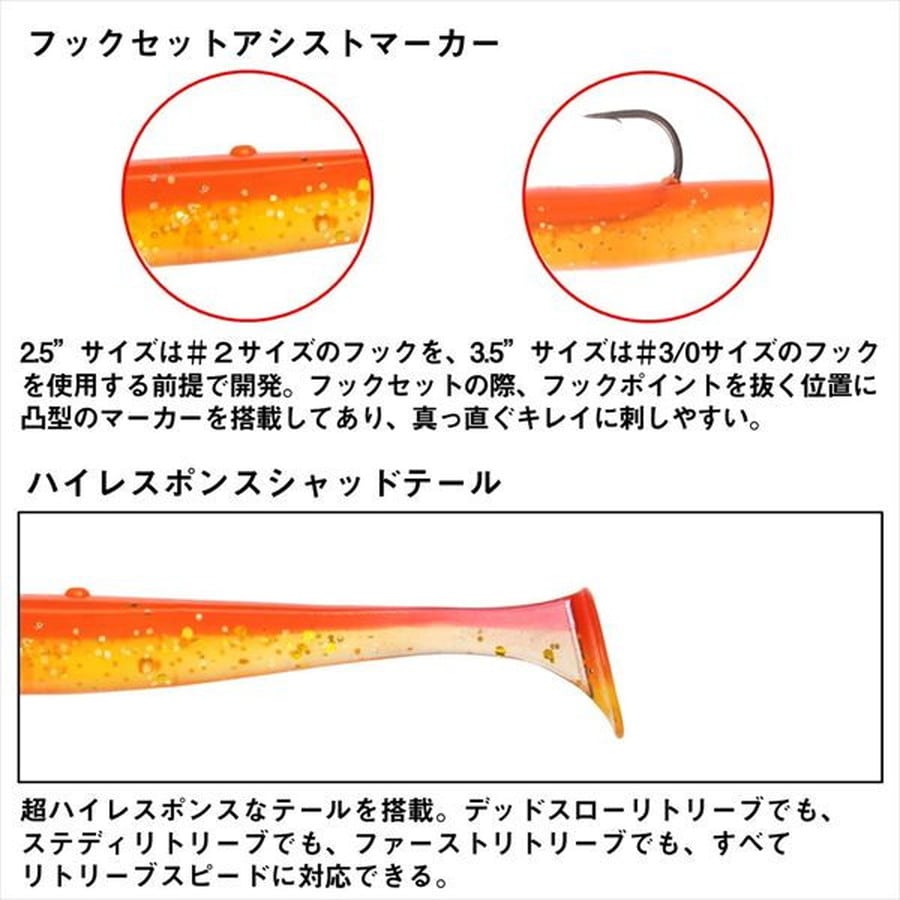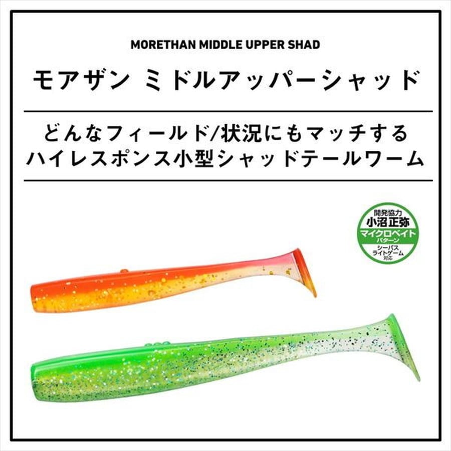 小沼正弥監修。高い環境適応能力を持ったハイレスポンス小型シャッドテールワーム。ミドルアッパーシャッドは、ジグヘッドリグでのただ巻きで使うことを想定して開発。ハイレスポンスに仕上げたテールは僅かな水流でも水を掴み、微振動を発生しアピールする。デッドスローからファストリトリーブまで幅広いリトリーブスピードに対応しバランスも崩さないことから、止水域から流れのあるエリア、更には表層からボトムまで様々なアプローチが可能。ボディにはジグヘッドを刺しやすいようフックセットアシストマーカーがあり、誰でもフックセットしやすい仕様となっている。ミドルアッパーとの使い分けはアピール力。アピールの弱いピンテールのミドルアッパーは小場所やピンスポットで、アピールの強いシャッドテールのミドルアッパーシャッドはオープンウォーターなど広範囲を探りたい時にオススメ。★全長:3.5インチ