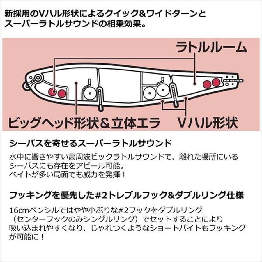 Vハル形状によるクイック&ワイドターンとスーパーラトルサウンドの相乗効果で捕食本能を刺激する魅惑のビッグペンシル。スレたランカーシーバスも思わず口を使う!★全長:135mm