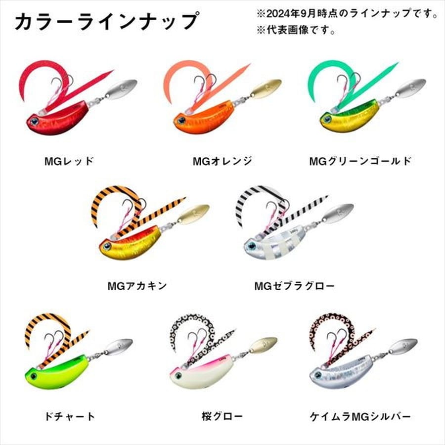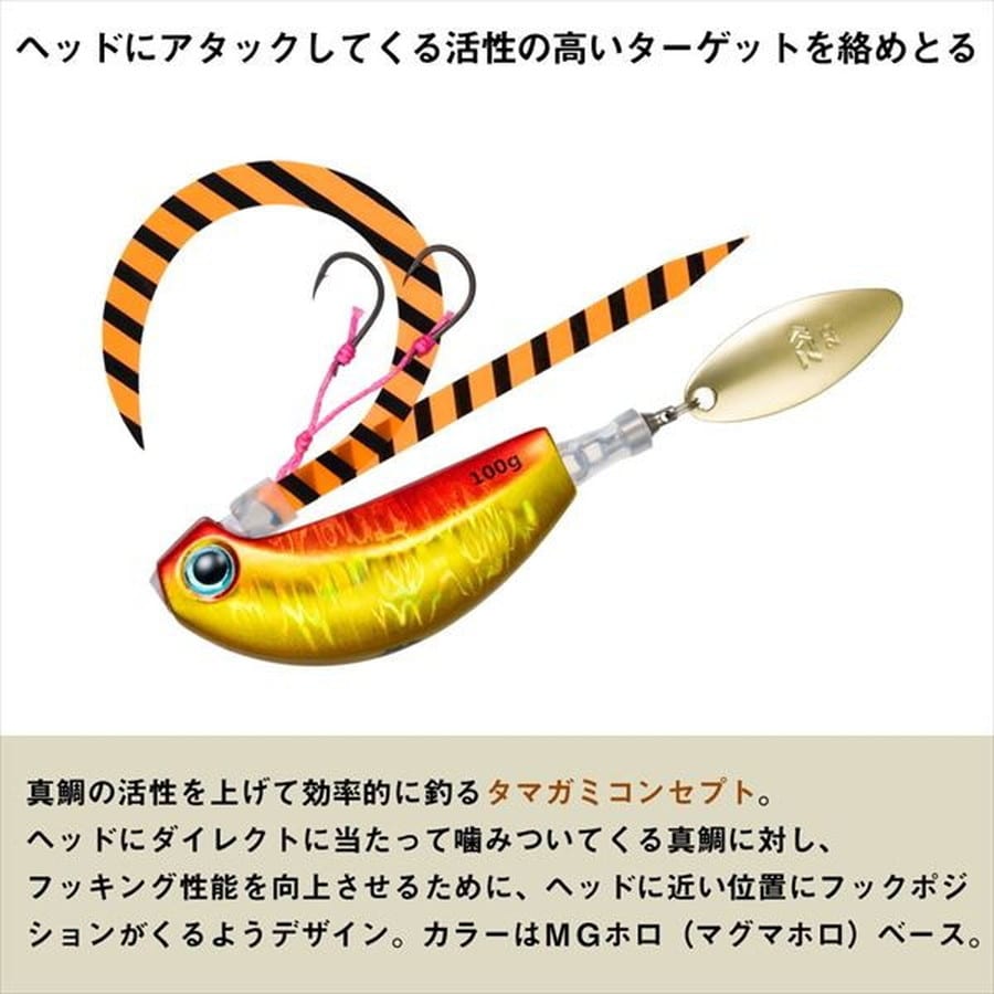 中井一誠が提唱する新メソッド「玉噛みコンセプト」を具現化した鉛製タイラバヘッド。中井一誠氏が提唱する、「真鯛の活性を上げて効率的に釣る」タイラバ新メソッド「玉噛みコンセプト」。ヘッドにダイレクトに当たってくる真鯛に対し、フッキング性能を向上させるために、ヘッドに近い位置にフックポジションがくるように新たにデザイン。タングステンとは異なる比重で使い分けることで更なる釣果アップ。MGホロ(マグマホロ)ベースでPHホロベースのタングステンとは、一瞬で区別可能。玉噛みコンセプト対応タイラバセット。ブレードを使って真鯛の活性を上げ、ヘッドに噛みつかせるようにして掛けていく玉噛みコンセプト。比重特性を活かしてしっかりフォールで魅せて、追わせるブレード付きタイラバセット。ボディ形状は専用デザインを採用し、ネクタイユニットとの絡みを軽減したトラブルフリー構造。安心のサクサスフック採用で優れたフッキング性能を発揮。★重量(g):120