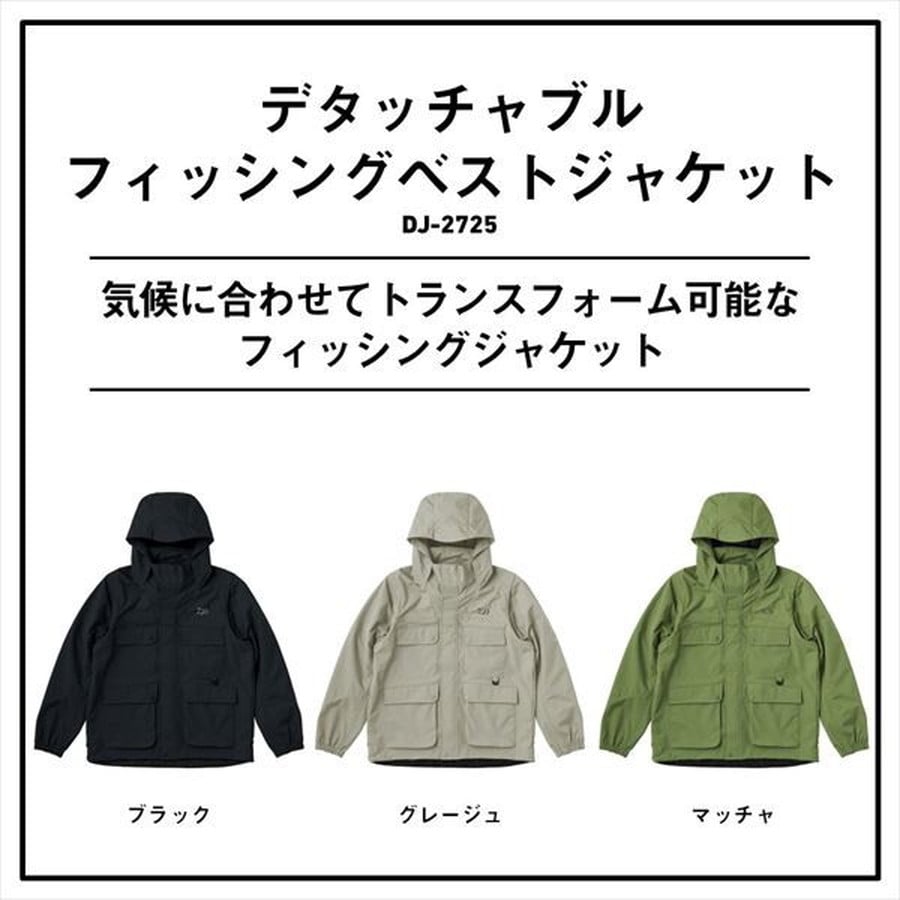 気候に合わせてトランスフォーム可能なフィッシングジャケット。ジャケットにもフィッシングベストにもなる便利アイテム。生地はレイン素材を採用することでフードを被れば、小雨程度であれば防げます。暑くなった時には、袖を外し、フードを収納することでフィッシングベストとして着用可能。フロントには、ピンオンリールホルダー、背面にはタモ付けに便利なDカン付き。背面ベンチレーション付きで蒸れを逃がし、快適に着用可能。腰の大型ポケットにはルアーケースも入りやすいマチ付き仕様。★サイズ:2XL
