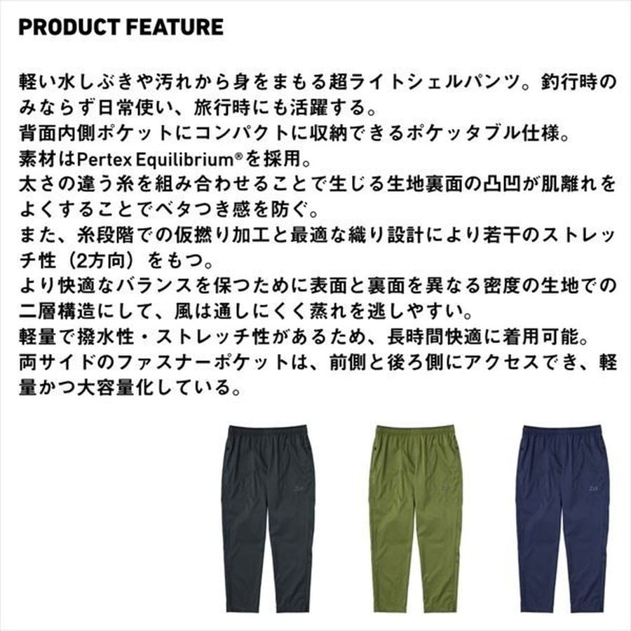軽量高機能素材Pertex Equilibrium採用。軽い水しぶきや汚れから身をまもる超ライトシェルパンツ。釣行時のみならず日常使い、旅行時にも活躍する。背面内側ポケットにコンパクトに収納できるポケッタブル仕様。太さの違う糸を組み合わせることで生じる生地裏面の凸凹が肌離れをよくすることでベタつき感を防ぐ。また、糸段階での仮撚り加工と最適な織り設計により若干のストレッチ性(2方向)をもつ。より快適なバランスを保つために表面と裏面を異なる密度の生地での二層構造にして、風は通しにくく蒸れを逃しやすい。軽量で撥水性・ストレッチ性があるため、長時間快適に着用可能。両サイドのファスナーポケットは、前側と後ろ側にアクセスでき、軽量かつ大容量化している。★サイズ:XL