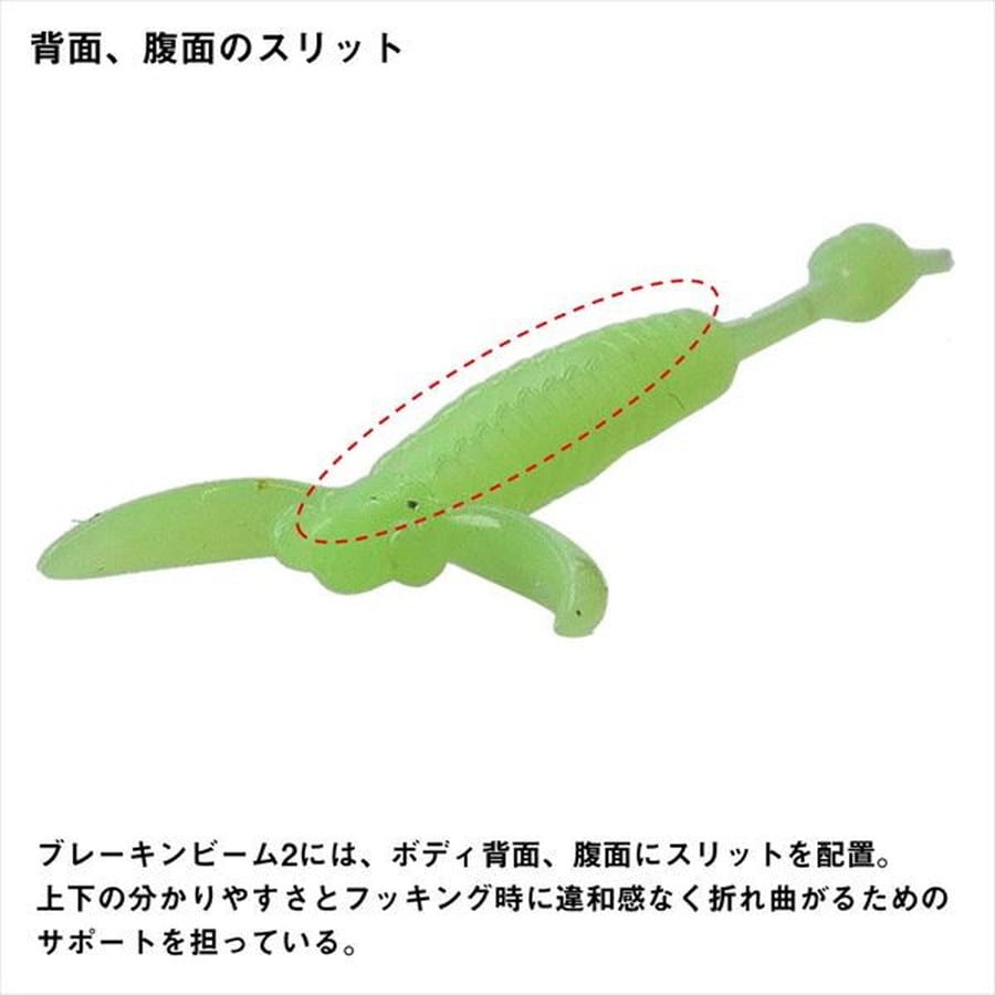 渡邉長士テスター監修。水中を浮遊するプランクトンを演出!水中を浮遊するプランクトンにマッチ・ザ・アクションさせるためには潮を噛むブレーキ力の高いワームが不可欠。ブレーキンビームはヘッド部にある特徴的なアームで強力なブレーキ力を発揮し、わずかな潮流でも潮を受けてプランクトンならではの「揺らぎ」を演出でき、この浮遊感はプランクトンパターンにおいて釣果に直結する重要な要素となる。浮遊感を出すためにはジグヘッドを軽くすることが必須だったが、ブレーキ力が強いため重めのジグヘッドを選択できるようになり、飛距離アップをしつつスローな攻めが可能になった★全長:2.0inch