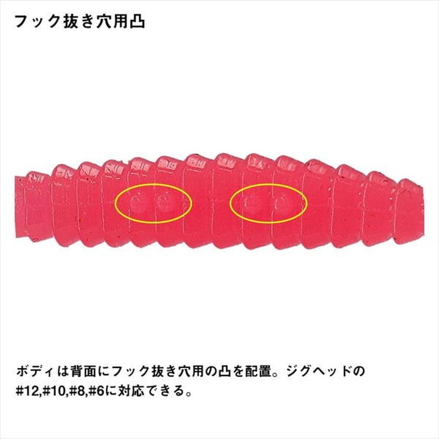 スローフォールでメバルに魅せるシャッドテールワーム。通常、シャッドテールを大きくすることで、フォールスピードを落とし、中層に浮いているメバルを攻略するが、アクションが大振りとなり神経質なメバルを攻略しにくい。ムーブビームはシャッドテールの大きさを最小限に留め、逆リブボディ形状による複雑な水絡みでスローフォールを実現。マテリアルも、スローフォールで弱く震える硬さに設定し、大きなアクションや動き過ぎを嫌うメバルに対して特に威力を発揮する。ボディ背面には、フックの抜き場所を示すポイントを設けており、抜き出し位置を分かりやすくし、フックセッティングの手間を軽減させている。★全長:1.5inch