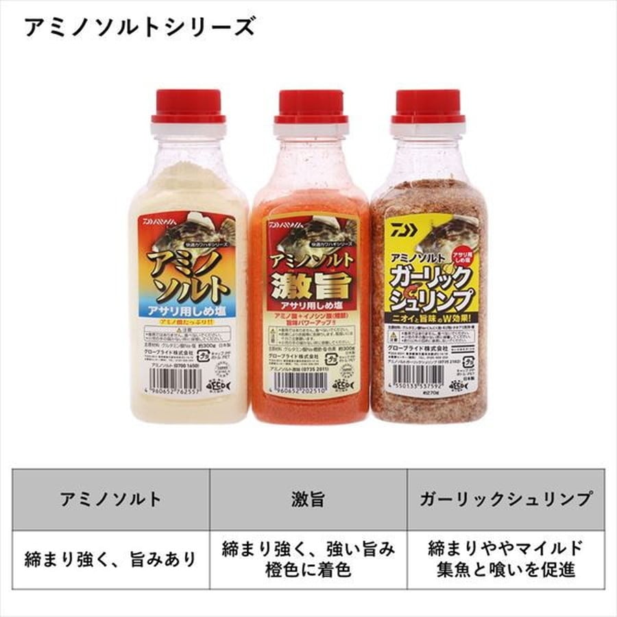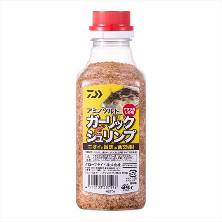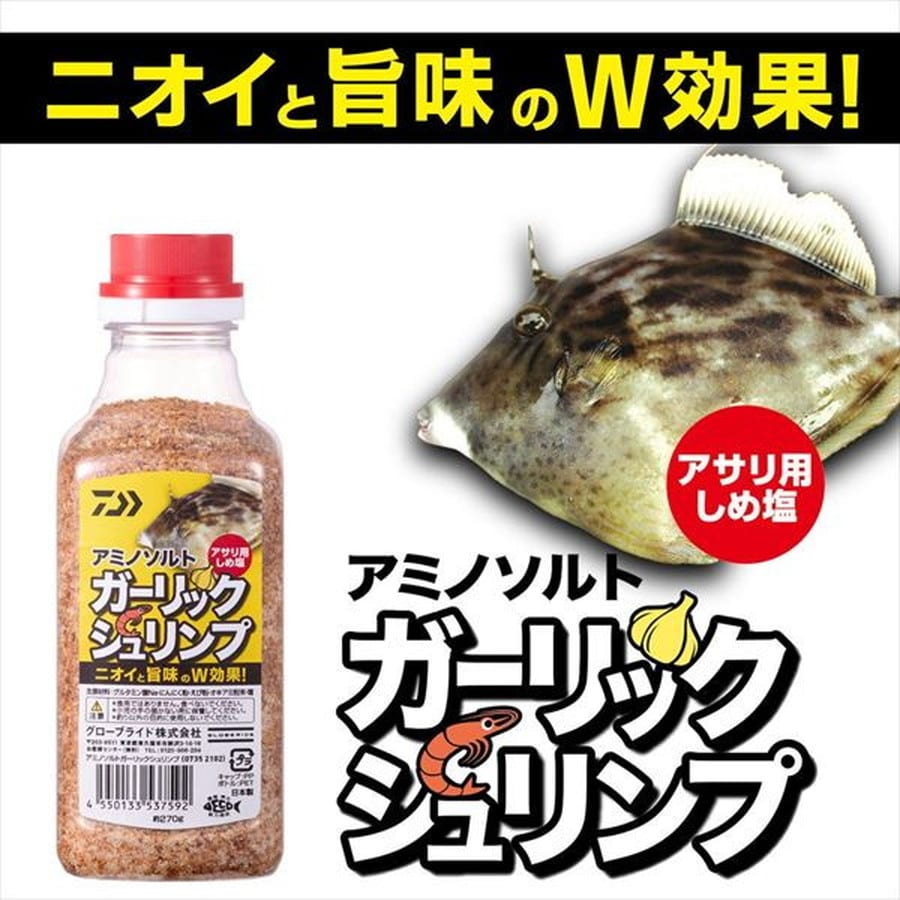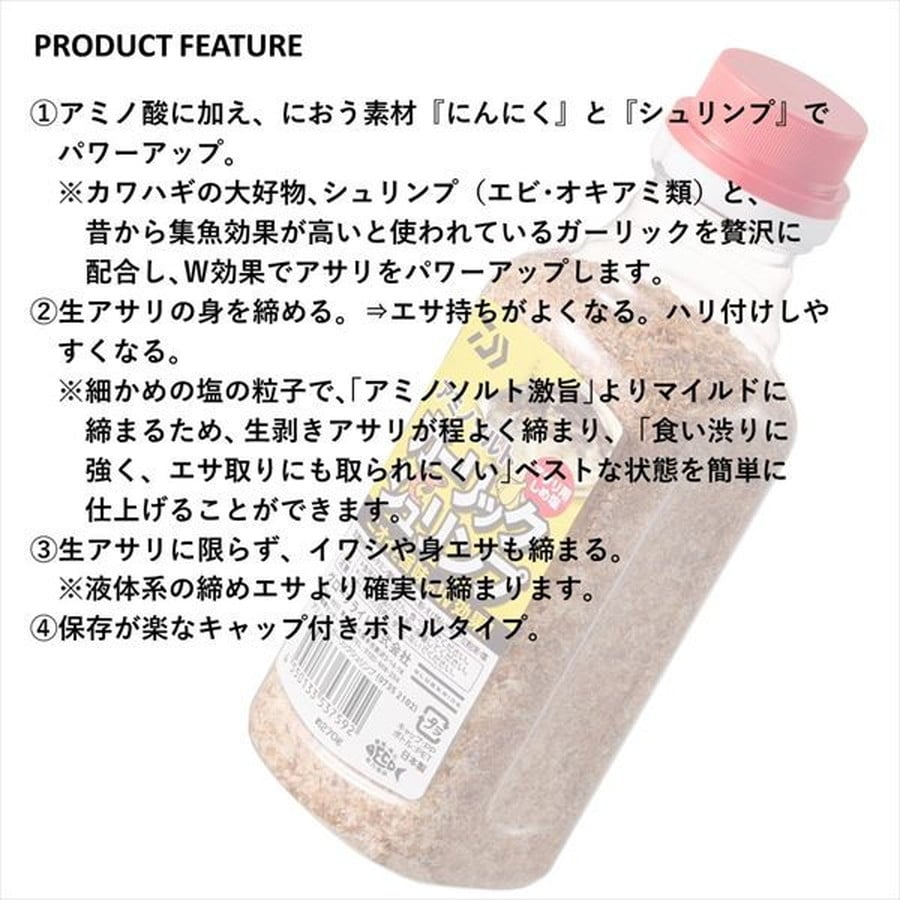 アミノ酸に加え、ガーリックとシュリンプを配合。ニオイと旨味のW効果でパワーアップ!アミノソルトシリーズに追加。●アミノ酸に加え、におう素材「にんにく」と「シュリンプ」でパワーアップ!※カワハギの大好物、シュリンプ(エビ・オキアミ類)と、昔から集魚効果が高いと使われているガーリックを贅沢に配合し、W効果でアサリをパワーアップします!●生アサリの身を締める。→エサ持ちがよくなる。ハリ付けしやすくなる。※細かめの塩の粒子で、「アミノソルト激旨」よりマイルドに締まるため、 生剥きアサリが程よく締まり、「食い渋りに強く、エサ取りにも取られにくい」ベストな状態を簡単に仕上げることができます。●生アサリに限らず、イワシや身エサも締まる。※液体系の締めエサより確実に締まります。●保存が楽なキャップ付きボトルタイプ。