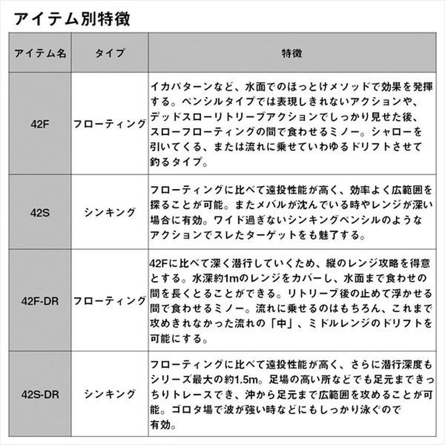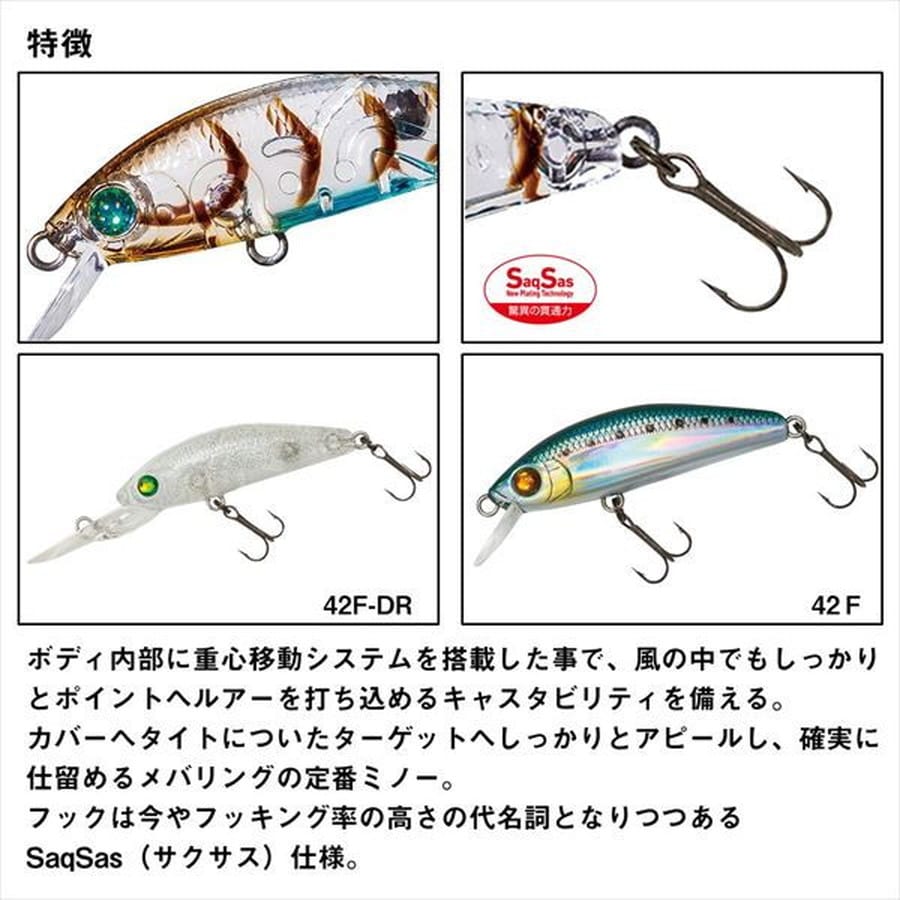 重心移動搭載で安定した飛距離が自慢のメバリング用ミノー。ボディ内部に重心移動システムを搭載した事で、風の中でもしっかりとポイントへルアーを打ち込めるキャスタビリティを備える。カバーへタイトについたターゲットへしっかりとアピールし、確実に仕留めるメバリングの定番ミノー。フックは今やフッキング率の高さの代名詞となりつつあるSaqSas(サクサス)仕様。★全長:42mm
