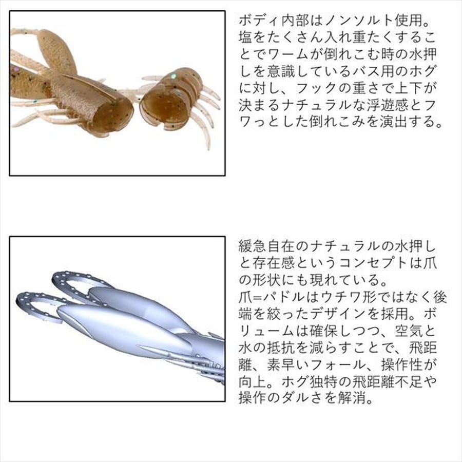 緩急自在のナチュラルな水押しと存在感でアピールするオールラウンダー!全国でブームを引き起こしている、フリリグチニングゲームの第一人者、森浩平テスター(通称:もりぞー)監修ワームの第3弾。低活性字のスローな展開を得意とするアーバンシュリンプに対し、アーバンホグは、よりボリュームが欲しい春の時期やアピールは最小限にテンポよく釣りを行う展開に有効。ナチュラルな水押しと存在感でアピールする。爪の形もチニング専用設計。爪をウチワ形にせず、後端を絞ったデザインを採用。ボリュームは確保しつつ空位抵抗を減らすことで飛距離と操作性が向上し、ホグ独特の飛距離不足や操作感のダルさを解消している。★全長:73mm