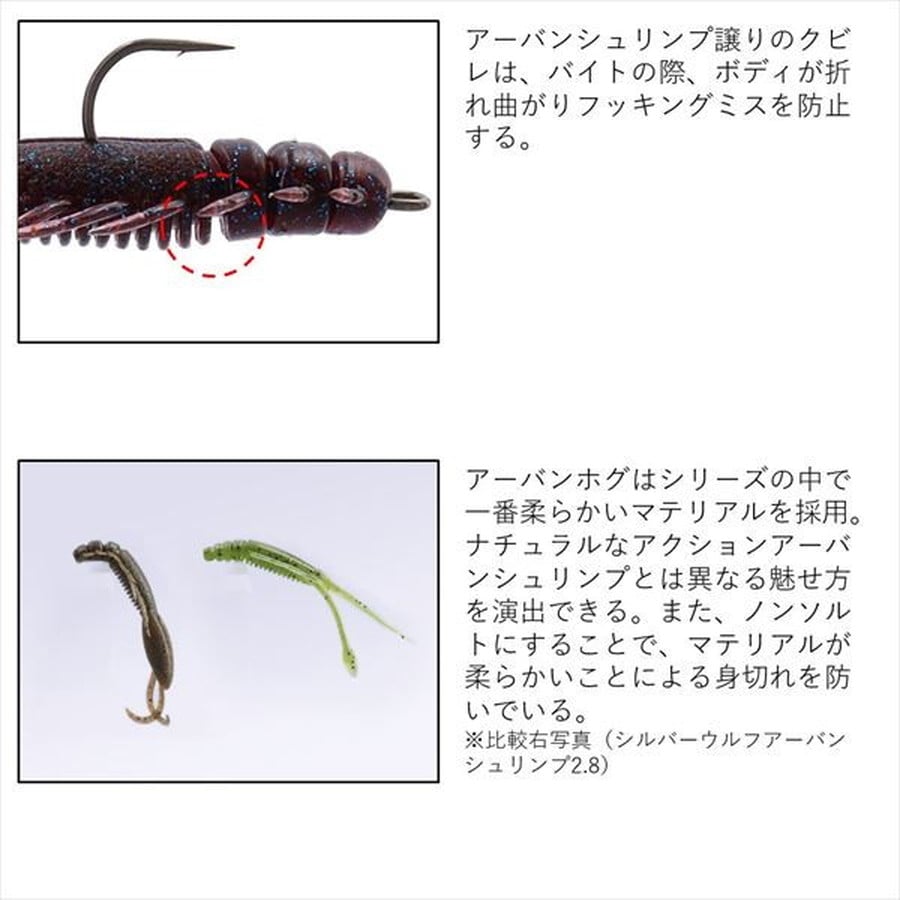 緩急自在のナチュラルな水押しと存在感でアピールするオールラウンダー!全国でブームを引き起こしている、フリリグチニングゲームの第一人者、森浩平テスター(通称:もりぞー)監修ワームの第3弾。低活性字のスローな展開を得意とするアーバンシュリンプに対し、アーバンホグは、よりボリュームが欲しい春の時期やアピールは最小限にテンポよく釣りを行う展開に有効。ナチュラルな水押しと存在感でアピールする。爪の形もチニング専用設計。爪をウチワ形にせず、後端を絞ったデザインを採用。ボリュームは確保しつつ空位抵抗を減らすことで飛距離と操作性が向上し、ホグ独特の飛距離不足や操作感のダルさを解消している。★全長:73mm