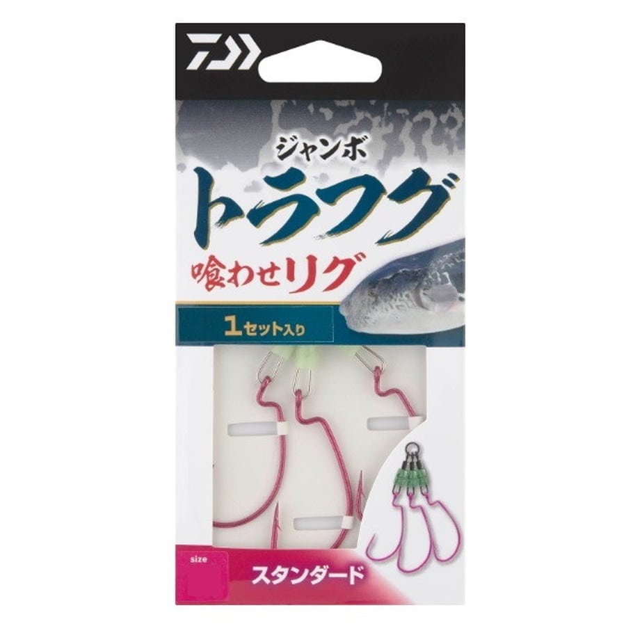 掛かりが良くエサのホールド性も高い、専用の極太オフセット針を使用、カラーはエビ(アルゼンチン赤エビ)対応のケイムラピンクを採用。抜群の強度を誇りながら針の交換がスムーズなジグスナップ仕様。リグの絡みを軽減させるソフトパイプ仕様とジャンボトラフグを捕る為に生まれた専用リグ。リグパターンは同フックサイズの3列仕様のスタンダードパターンと、センターの針を段差仕様にした段差仕様の2パターン展開。