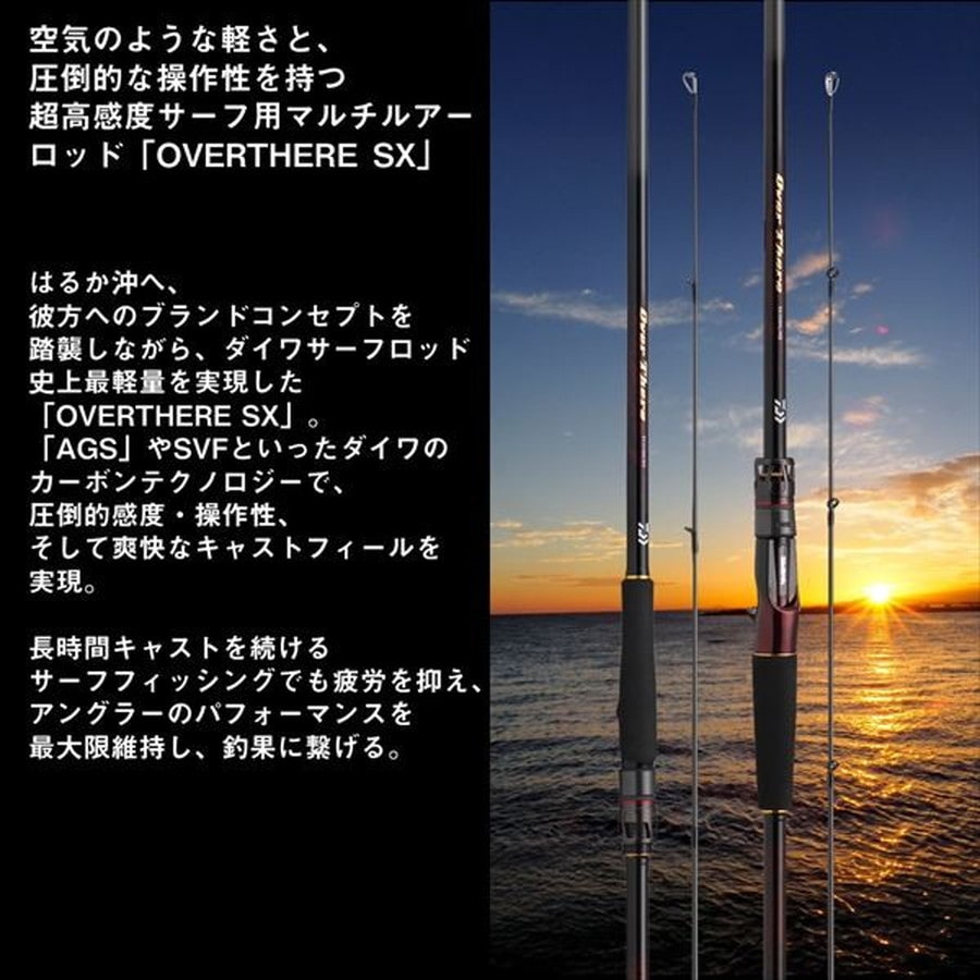 空気のような軽さと、圧倒的な操作性を持つ超高感度サーフ用マルチルアーロッド「OVERTHERE SX」■SX911M/MH(ハイパワーテクニカルモデル)・・・しなやかなMクラスのティップを持ちながら、強靭なMHクラスのバットを持つショートモデル。小型メタルジグやミノー等を軽快に操作しながら、青物や座布団ヒラメのような大型魚とのファイトに対応。ベイトが小さい時等、ロングロッドでは捕れないシチュエーションで魚を捕るためのショートロッド。