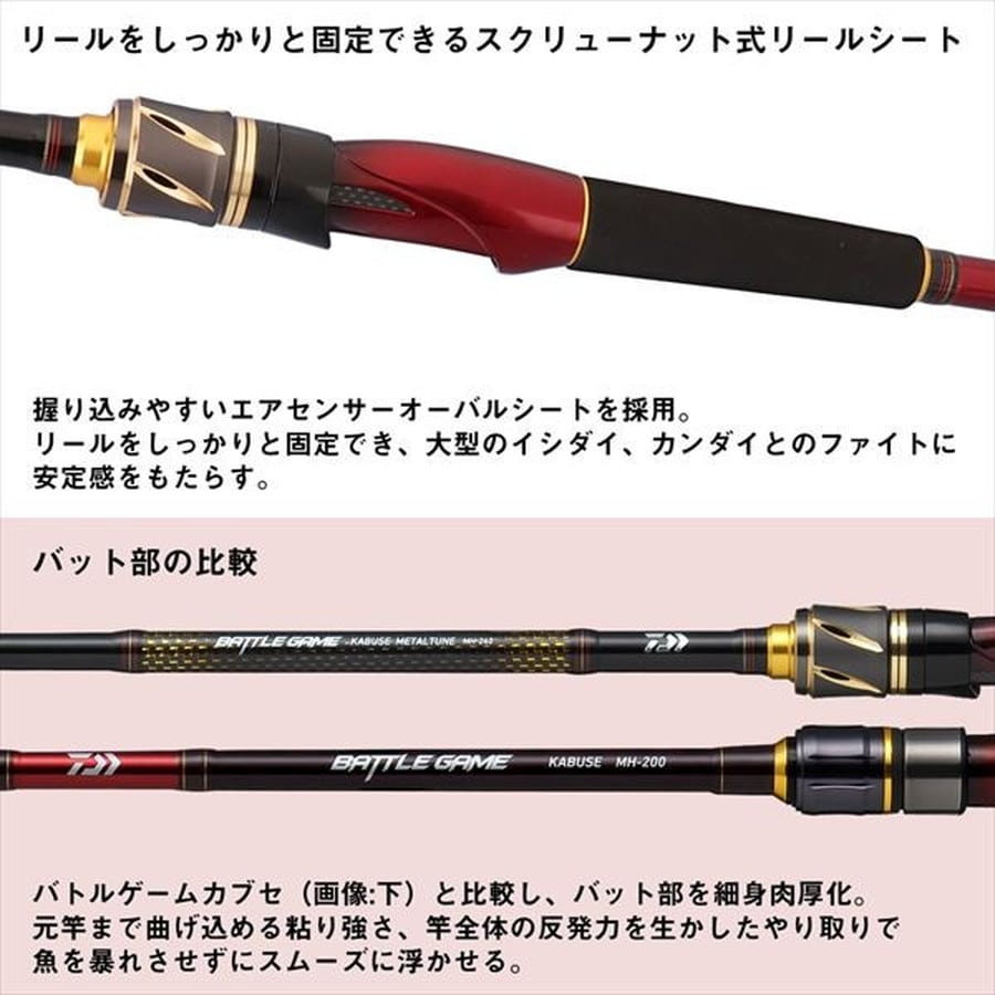 目感度と手感度を高次元で兼ね備え繊細な攻めを可能にするテクニカルカブセロッド。繊細なアタリを鮮明に表現する、柔軟かつしなやかなメタルトップを採用したカブセ釣り専用モデル。手感度と目感度を両立する穂先は、スレた大型魚の繊細なアタリを手元まで明確に伝え、穂先の巻き込みトラブルにも強い。曲げ込むほどに強靭な粘りを発揮するブランクは、大型のイシダイ、イシガキダイ、カンダイなどの強烈な引きをあしらい、主導権を与えないやり取りを可能にする。■MH-240・・・汎用性の高いオールラウンドモデル。しなやかな#1により魚に違和感なく食わせ、竿のストロークを活かしたやり取りが可能。