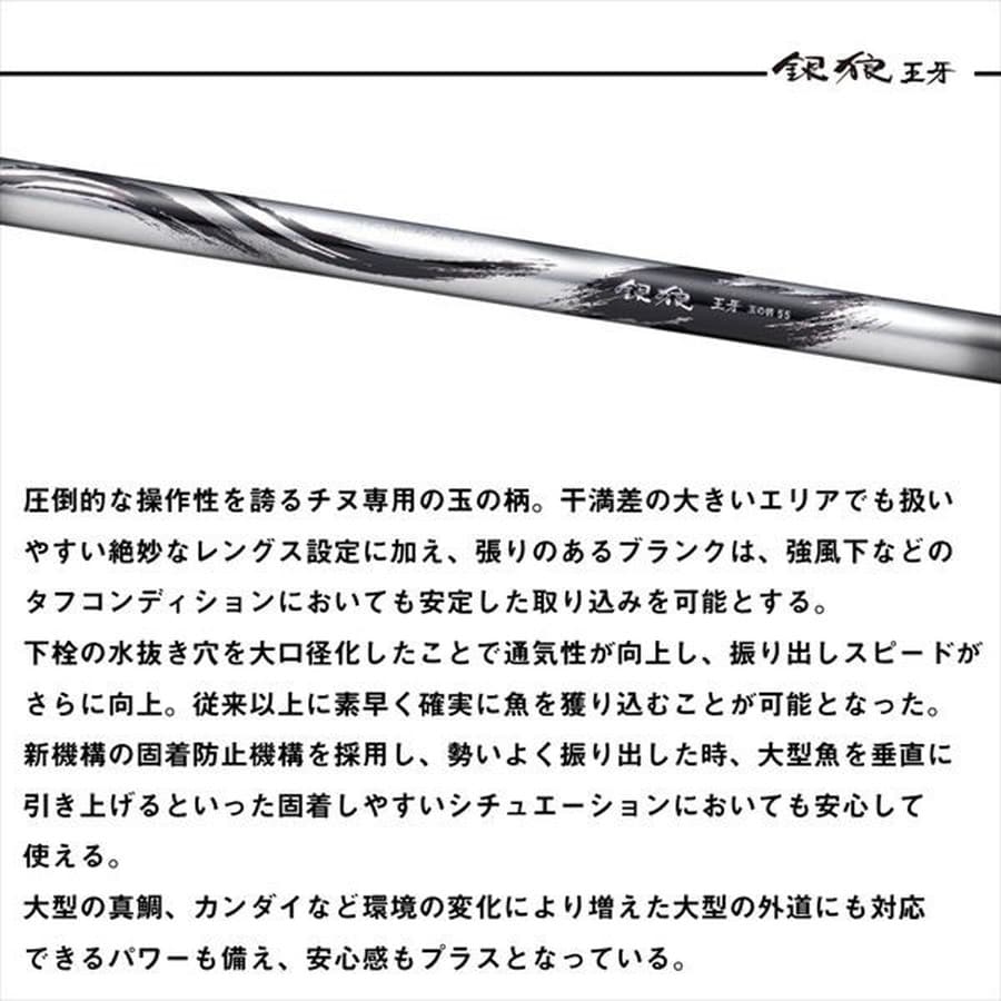 革新的な快適性を備えた銀狼シリーズ玉の柄。際立った操作性を誇るチヌ専用の玉の柄。干満差の大きいエリアでも扱いやすい絶妙なレングス設定に加え、堅牢な張りのあるブランクは、強風下などのタフコンディションにおいても安定した取り込みを可能とする。下栓の水抜き穴を大口径化したことで通気性が向上し、振り出しスピードがさらに向上。従来以上に素早く確実に魚を獲り込むことが可能となった。新たに搭載された固着防止機構により、勢いよく振り出す場面や、大型魚を垂直に引き上げるような固着しやすいシチュエーションでも安心して使用でき、環境の変化により増加傾向にある大型の真鯛やカンダイといった不意の大物にも対応可能なパワーを備える。