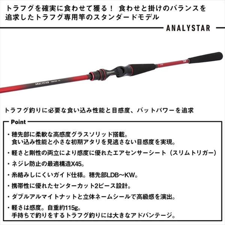 トラフグを確実に食わせて獲る! 食わせと掛けのバランスを追求したトラフグ専用竿のスタンダードモデル。穂先部に柔軟なグラスソリッドを搭載することで、トラフグに違和感なくエサを食わせるしなやかさと、目感度を実現。脇挟みと両手持ち双方が可能なバットレングスは、快適な誘いと安定したファイトを可能とする。更に、全長を195センチとすることで、上下の誘いストロークとフッキングストロークを確保。ジャンボトラフグにものされないバットパワーを携えた先鋭7:3調子。