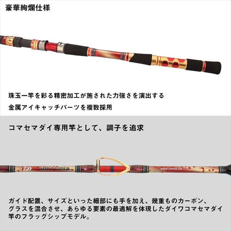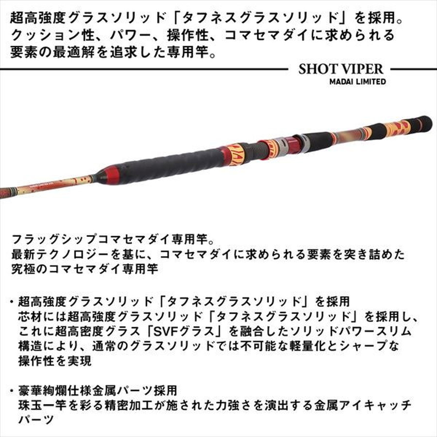 ダイワコマセマダイ史上、最高クラスのクッション性とパワーを追求。芯材には超高強度グラスソリッド「タフネスグラスソリッド」に、超高密度グラス「SVFグラス」を融合したソリッドパワースリム構造を採用したダイワコマセマダイ竿のフラッグシップモデル。通常のグラスソリッドでは不可能な軽量化とシャープな操作性を実現。■255・・・手持ち・置き竿の双方に対応可能なクッション性が魅力のオールラウンドモデル