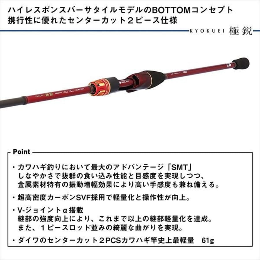 ハイレスポンスバーサタイルモデルのBOTTOMコンセプト。携行性に優れたセンターカット2ピース仕様。非常にしなやかなSMTから、急速にパワーのある穂持につながる1354調子。カワハギ釣りの基本となる、底にオモリを置いた誘いの操作がしやすい「BOTTOM」コンセプト。本作は、歴代の極鋭カワハギBOTTOMシリーズ内で最高クラスのパワーを穂持に持たせ、操作性と手感度に磨きをかけたハイレスポンスモデル。細径SMTとパワーのある穂持の相性は秀逸で、SMTの魅力である目感度と手感度の両立を高次元で可能にした。底での釣りは勿論、宙釣りやキャスティングを始め、あらゆる釣法に対応可能な汎用性も備える。V-ジョイントα搭載で、携行性に優れたセンターカット2ピースながら1ピースと遜色ない操作性と軽さを実現。