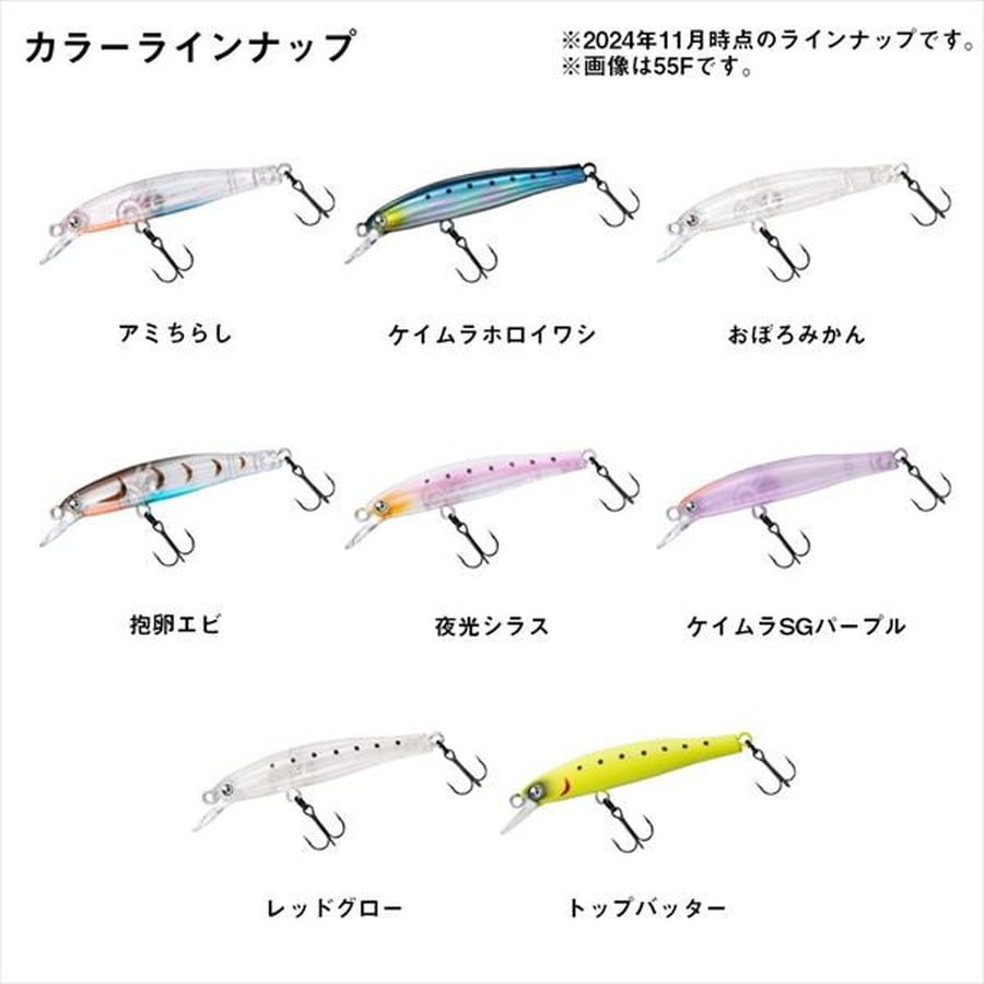 沖メバルを釣るノウハウを詰め込んだ岩崎林太郎渾身のスリムミノー!岩崎林太郎監修。マグネット重心移動を搭載し、安定した飛距離を確立。重心移動の距離も煮詰め、着水からすぐにアクションへ移行できるように調整。着水後すぐにアクション出来るレスポンスの高さを実現した。また、移動重心ウエイトは磁着時にあえてボディの真ん中へ収まる様に設定。スローリトリーブでしっかりアクションしつつも、突然ふらっとアクションが破綻するように調整した。一定のアクションでは見切ってしまうメバルに対しニュートラルにバイトスイッチを入れることが可能となっている。55Fは水深1mより浅いレンジを得意とし、55Sはフローティングに比べて遠投性能が高く沖のメバルやレンジが深い場合に有効。アイテムごとに異なるアイカラーを採用。(Fモデル:白/Sモデル:赤)★全長:55mm
