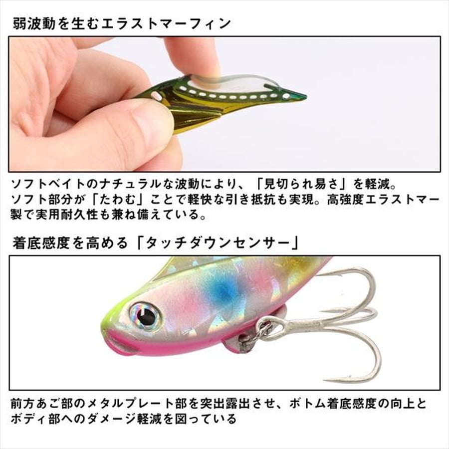 こんなテッパン見たこと無い!新発想「メタルバイブ×ソフトベイト」がコンセプト。ナチュラル波動を発するハイブリッド鉄板バイブ。エラストマーフィン(背びれ)搭載のメタルバイブ(PAT.P)。メタルバイブの飛距離、沈み、感度とソフトベイトのナチュラルな波動を兼ね備えた新コンセプト。ナチュラルな水切り波動で「見切られ易さ」を軽減。メタルバイブの重い引き抵抗を、背中のソフトベイト部分が「たわむ」ことで軽減。潮流抵抗もよりわかり易い。あご部分に本体鉄板部をむき出しにすることで、着底感度を向上。ソフトベイト部分はクリアー仕上げで背ビレをイメージ。ナチュラル且つコンパクトに見せることができる。スナップの取り外しがし易い楕円スイベルアイ。山内勝己テスター監修。★全長:60mm