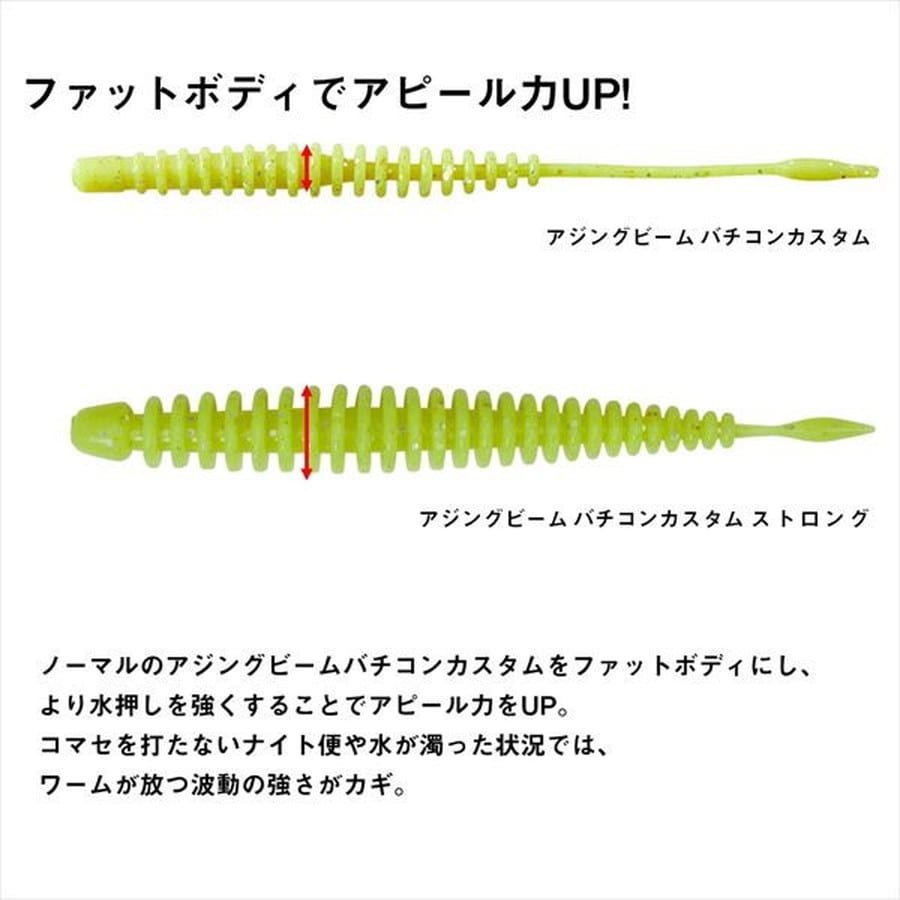 ハイアピールFATボディのSTRONGバージョン。高密度リブとファットボディが広範囲の魚にアピールしアジを寄せる!コマセを打たないナイト便や水が濁った状況では、ワームが放つ波動の強さがカギとなる。そのためノーマルのアジングビームバチコンカスタムをファットボディにし、より水押しを強くすることでアピール力をUP。ボディ軸を細くしアジの吸い込みに対応。一見すると、アジの口への吸い込みが悪いように見えるが、ボディ軸を細くすることでアジの吸い込みに対応。しっかりとボディが折れ曲がることでスムーズにアジの口に吸い込まれる構造になっている。アミノ酸特殊誘引剤「アミノX」とシュリンプパウダーをふんだんに配合し集魚力が鍵になるバチコンアジングに最適な仕様。一般的なワーム素材として使用される素材「塩ビ」を採用することで揺れる船上でもジグヘッドにセットしやすい。★全長:2.3inch