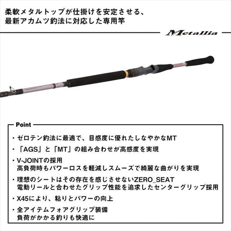 柔軟メタルトップが仕掛けを安定させる、最新アカムツ釣法に対応した専用竿。しなやかなメタルトップがこれまでにない目感度を実現。穂先部には、従来の中深場竿よりもしなやかな「メタルトップ」を搭載。うねりの中でもしっかりと仕掛けを安定させるゼロテンキープ力と、アカムツと外道を鮮明に判別できる目感度を実現。アタリに遅れずに合わせるために、穂持ちとバット部にパワーを持たせ、独自の調子セッティングを施したアカムツ専用竿。■ゼロテン釣法に最適で、目感度に優れたしなやかなMT ■「AGS」と「MT」の組み合わせが高感度を実現 ■V-JOINTの採用。高負荷時もパワーロスを軽減しスムーズで綺麗な曲がりを実現。■理想のシートはその存在を感じさせないZERO_SEAT。電動リールと合わせたグリップ性能を追求したセンターグリップ採用。■X45により、粘りとパワーの向上。■全アイテムフォアグリップ装備