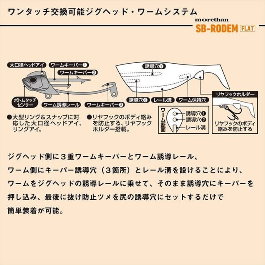 シーバス専用バイブレーションジグヘッド+ワームセット「SBロデム」に、フラットサイドシャッドモデルが登場!シーバスがサッパ・コノシロを偏食している時、ビッグベイトパターンでの中~底層狙いに有効!●ジグヘッド及びソフト樹脂ボディの背を高くすることでボディから発するバイブレーション波動&視覚アピールが強くなり、バタバタテールスイングとの融合によりベイトが多いとき、大きいときでも存在をアピール可能。●水鳥の足ヒレ形状からヒントを得た「ダックフィンテール」を搭載。その独特の形状は水 つかみが良く振り子状に大きく左右にスイングする為、強いバイブレーション&ロールアクションを発生。●ヘッド前方下部のブレード(ボトムタッチセンサー)により着低感度が向上。大型リング&スナップに対応した大口径ヘッドアイ、リングアイ ●リヤフックのボディ絡みを防止する、リヤフックホルダー搭載。