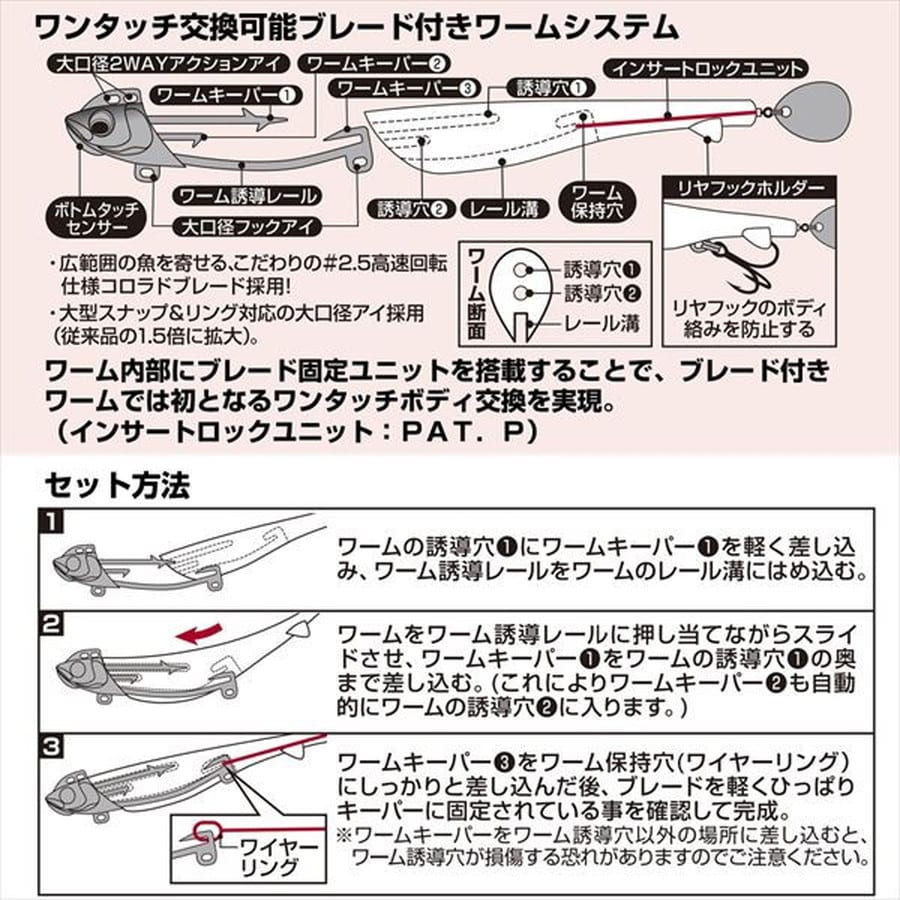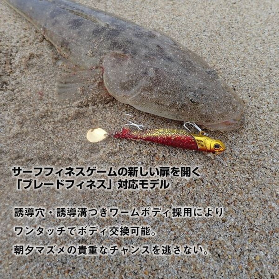 ヒラメ、マゴチを魅了するジグヘッド+ワームセット「RODEM」が、ブレード搭載&「R」の名を冠してブラッシュアップ!サーフフィネスゲームの新しい扉を開く「ブレードフィネス」対応モデル。誘導穴・誘導溝つきワームボディ採用によりワンタッチでボディ交換可能。リヤフックのボディ絡みを防止する、リヤフックホルダーを追加。★全長:4inch