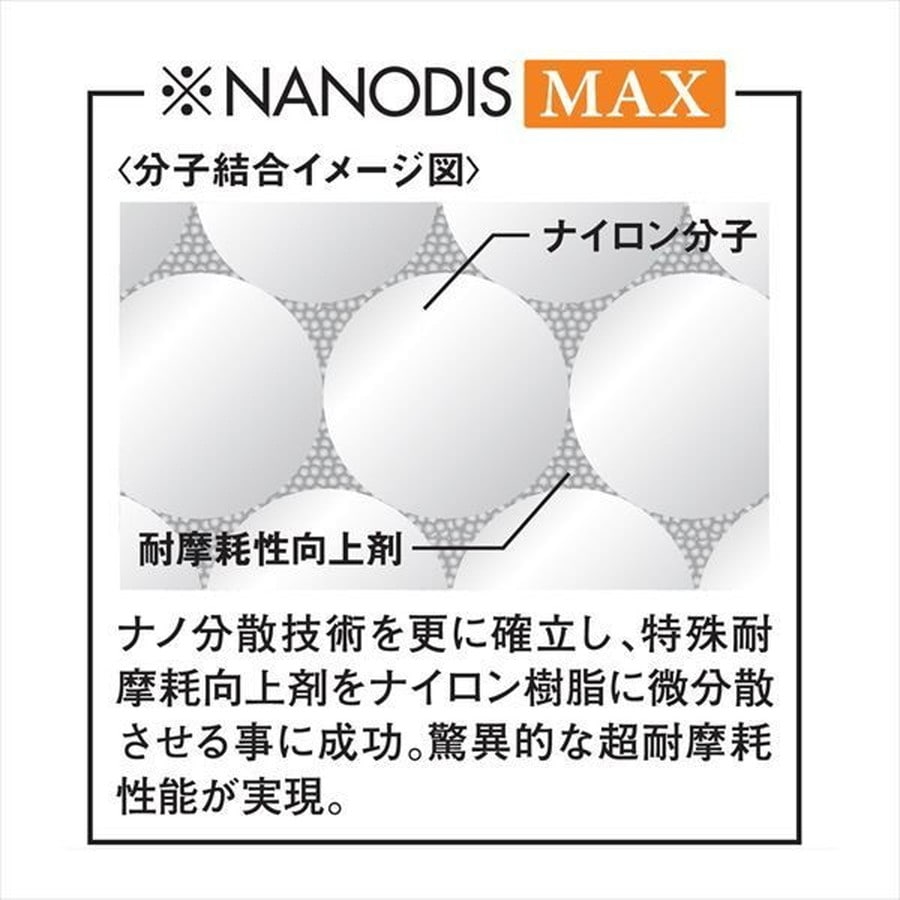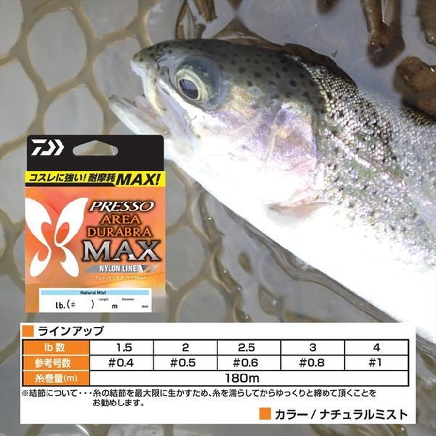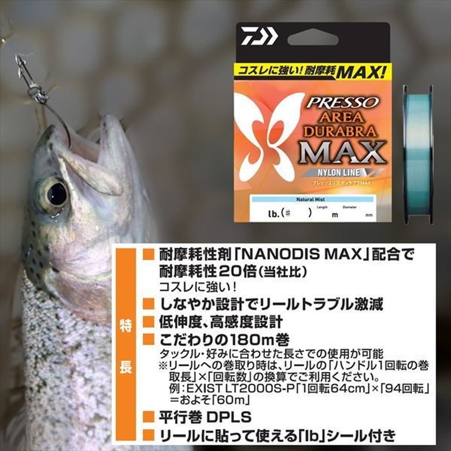 耐摩耗性MAX、コスレに強いナイロンライン!耐摩耗性剤「NANODIS MAX」配合で耐摩耗性20倍(当社比)。コスレに強い!しなやか設計でリールトラブル減少。低伸度、高感度設計。こだわりの180m巻。タックル・好みに合わせた長さでの使用が可能。※リールへの巻取り時は、リールの「ハンドル1回転の巻取長」×「回転数」の概算でご利用ください。リールに貼って使える「lb」シール付き。