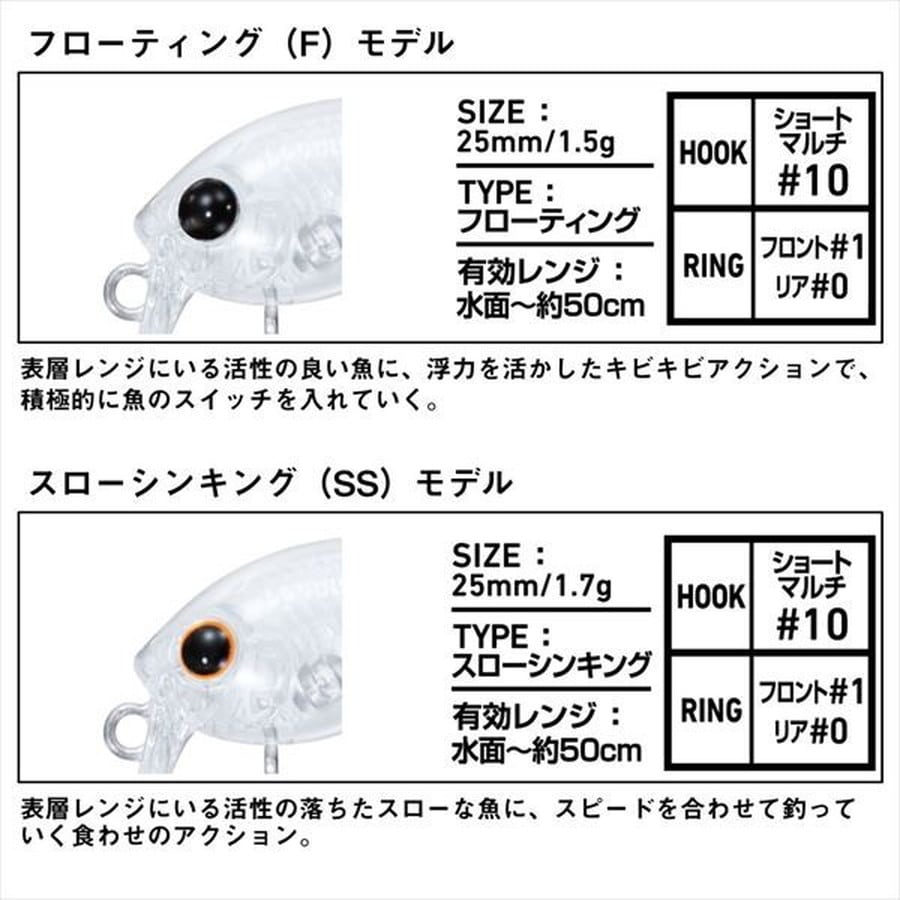 トーナメントで勝てるコンパクトクランクベイト。和田浩輝モニター監修。ワイドウォブルを実現するための扁平ボディ。左右への水切り能力を高め、ワイドなウォブリングアクションを実現。デッドスローでもしっかり動く、ワイドアクション。ラトル仕様で、音でのアピールをプラス。◆スローシンキングモデル・・・表層レンジにいる活性の落ちたスローな魚に、スピードを合わせて釣っていく食わせのアクション。★全長:25mm