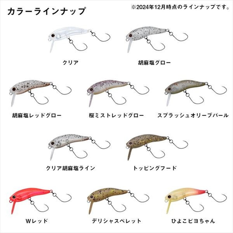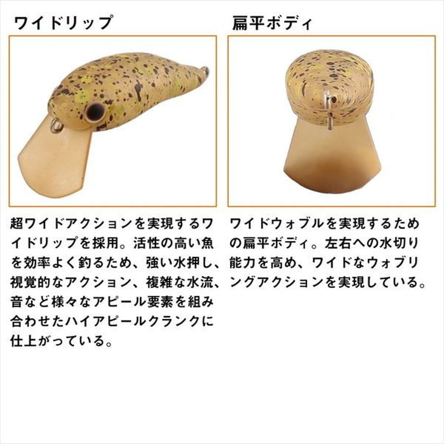 広範囲から魚を呼ぶハイアピール表層クランク!超ワイドアクションで水押しが強く、湾曲したボディが複雑な水流を発生させ広範囲の魚にアピール。◆スリムなボディは通常のクランクベイトよりもアクションが大きく見え、視覚的にもアピールが強い。◆メインウエイトが左右に揺れ、音によるアピールもプラス。◆ワイドリップ。超ワイドアクションを実現するワイドリップを採用。活性の高い魚を効率よく釣るため、強い水押し、視覚的なアクション、複雑な水流、音など様々なアピール要素を組み合わせたハイアピールクランクに仕上がっている。◆扁平ボディ。ワイドウォブルを実現するための扁平ボディ。左右への水切り能力を高め、ワイドなウォブリングアクションを実現している。◆ダブルリング仕様。フッキング性能を高めるダブルリング仕様。活性の高い魚の強烈なバイトは弾かれることも多く、どんなバイトでも絡めとるダブルリング仕様を採用。掛けた後もバレにくい。★全長:39mm