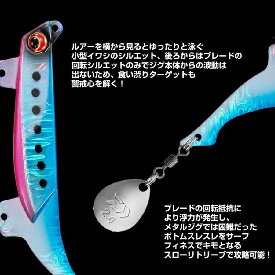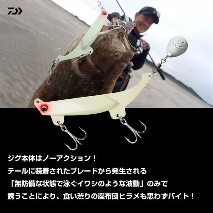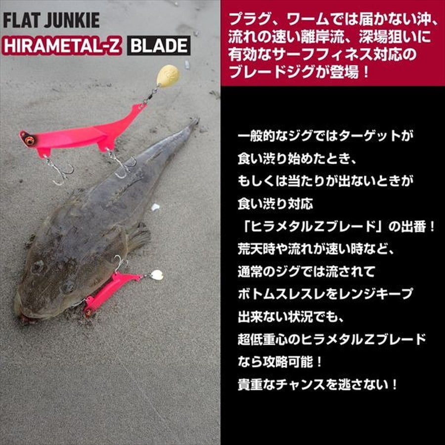 プラグ、ワームでは届かない沖、流れの速い離岸流、深場狙いに有効なサーフフィネス対応のブレードジグが登場!ジグ本体はノーアクション!テールに装着されたブレードから発生される「無防備な状態で泳ぐイワシのような波動」のみで誘うことにより、食い渋りの座布団ヒラメも思わずバイト!ルアーを横から見るとゆったりと泳ぐ小型イワシのシルエット、後ろからはブレードの回転シルエットのみでジグ本体からの波動は出ないため、食い渋りターゲットも警戒心を解く!一般的なジグではターゲットが食い渋り始めたとき、もしくは当たりが出ないときが食い渋り対応「ヒラメタルZブレード」の出番!荒天時や流れが速い時など、通常のジグでは流されてボトムスレスレをレンジキープ出来ない状況でも、超低重心のヒラメタルZブレードなら攻略可能!貴重なチャンスを逃さない!