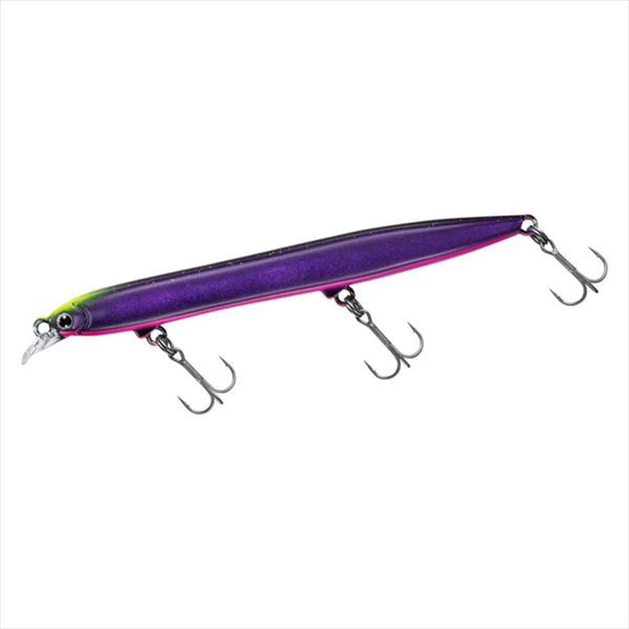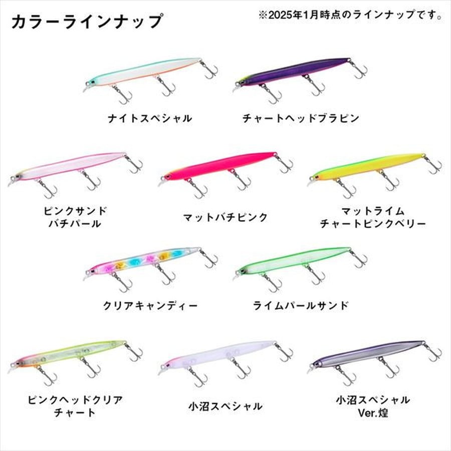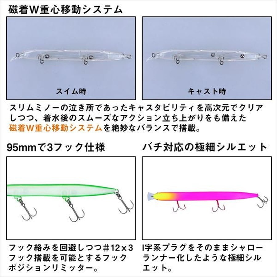 小沼正弥監修。密かに爆れ。バチ、サヨリ、シラス、激スレパターン対応、極細シルエットの水面直下攻略型ぶっ飛びシャローランナー。細身・小型ベイトに偏食している時、激スレ時に最適。バチ、サヨリ、シラスはもとより、イワシや稚アユ等の小型ベイトパターンにベストマッチな極スリムシルエット。高レスポンス&スレに強いタイトウォブンロール+テールスライドアクションで、低速~高速まで全てのリトリーブに対応。ロッドポジションとリトリーブ速度の組み合わせで水面直下~約30cmが有効レンジ。風雨等でI字系スリムプラグが太刀打ちできない状況でも、一枚下のレンジでしっかりアピールできる。極細ボディながら磁着重心移動を前後にダブルで搭載し、「スリムミノーは飛ばない」イメージをくつがえす快適なキャスタビリティと立ち上がり性能を両立。★全長:95mm