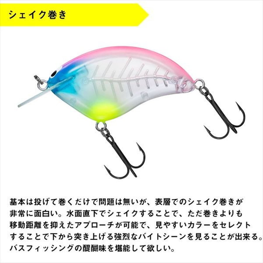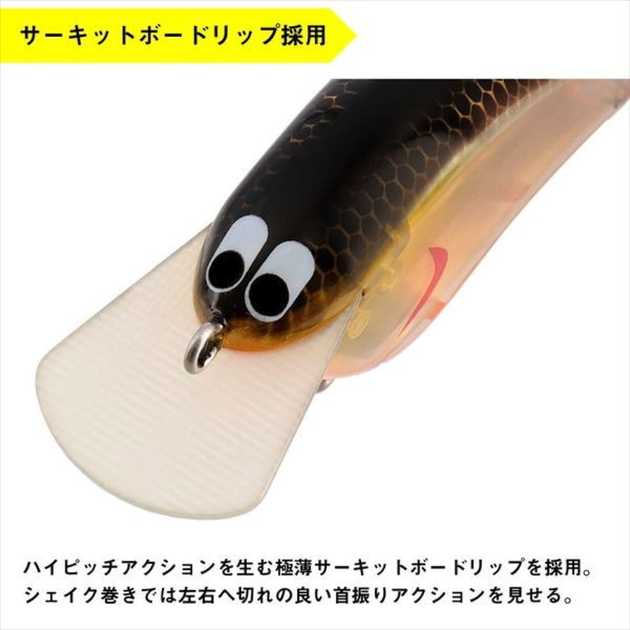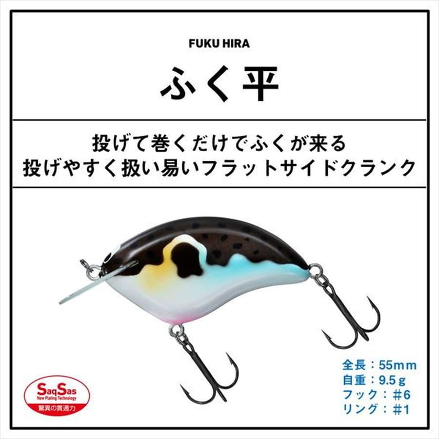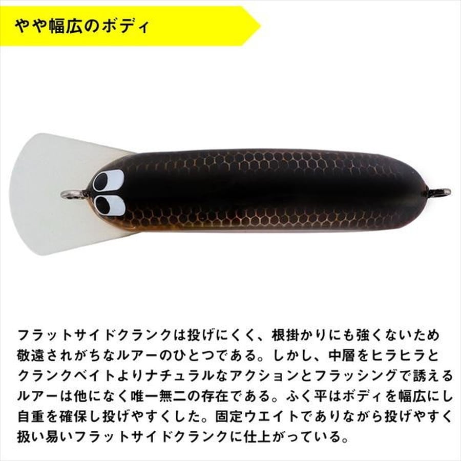 投げて巻くだけでふくが来る。投げやすく扱い易いフラットサイドクランク。使って楽しいフラットサイドクランクを目指して開発。サーキットボードリップ採用でただ巻き時のハイピッチアクションはもちろん、シェイク巻きでは左右へ切れの良い首振りアクションを見せる。表層での首振りアクション中のバイトはバイトシーンが丸見えで、バスフィッシングの醍醐味を味わうことが出来る。やや幅広に設計されたボディは十分な自重を確保でき投げやすく、フラットサイドクランクでも扱い易い。カラーはノーマルカラー以外に反射板を採用したRカラーと骨を入れたBNカラーをラインナップ。フラットサイドクランク特有のフラッシングで誘うアプローチを意識したラインナップとなっている。