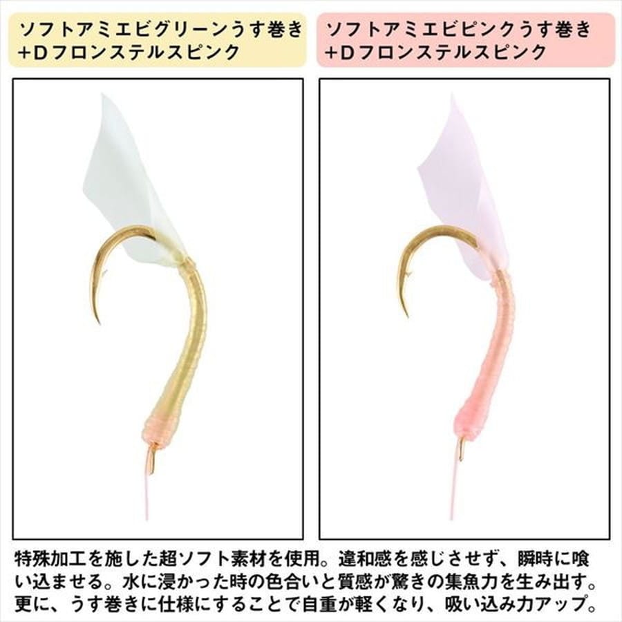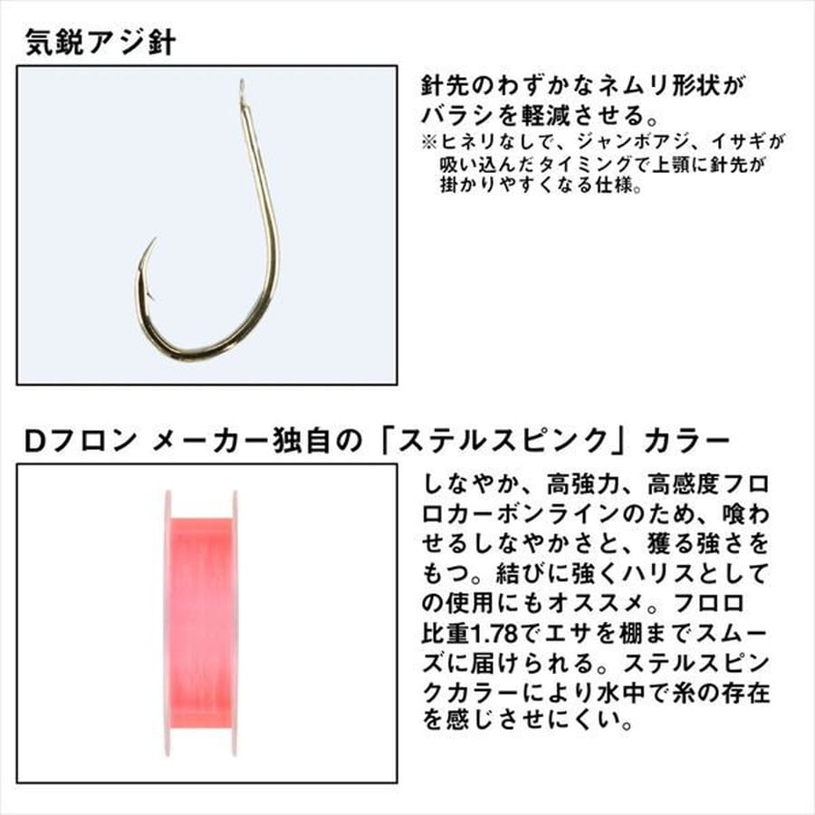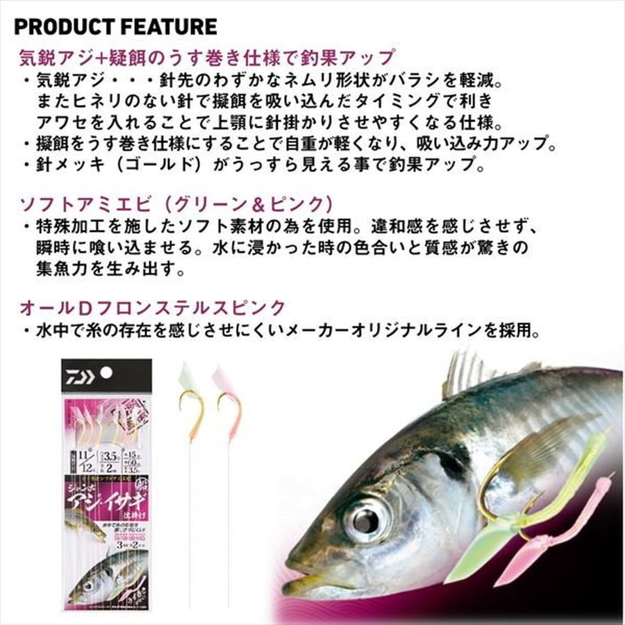 有力船頭直伝のこだわり仕様。 操作性・手返しを重視しながらも喰い渋る状況化にも対応。天秤釣りでアジ・イサギ(イサキ)を釣りあげる為のノウハウを凝縮。操作性・手返しを重視しながらも喰い渋る状況化にも対応。船頭直伝のこだわりの仕様が納得の釣果をサポート。●気鋭アジ+疑餌のうす巻き仕様で釣果アップ!!気鋭アジ:針先のわずかなネムリ形状がバラシを軽減させます。またヒネリのない針で擬餌を吸い込んだタイミングで利きアワセを入れることで上顎に針掛かりさせやすくなる仕様です。擬餌をうす巻き仕様にすることで自重が軽くなり、吸い込み力アップ ●ソフトアミエビ(グリーン&ピンク) 特殊加工を施した超ソフト素材の為を使用。違和感を感じさせず、瞬時に喰い込ませます。水に浸かった時の色合いと質感が驚きの集魚力を生み出します。●オールDフロンステルスピンク。水中で糸の存在を感じさせにくいDAIWAオリジナルラインを採用。★仕掛全長(cm):200