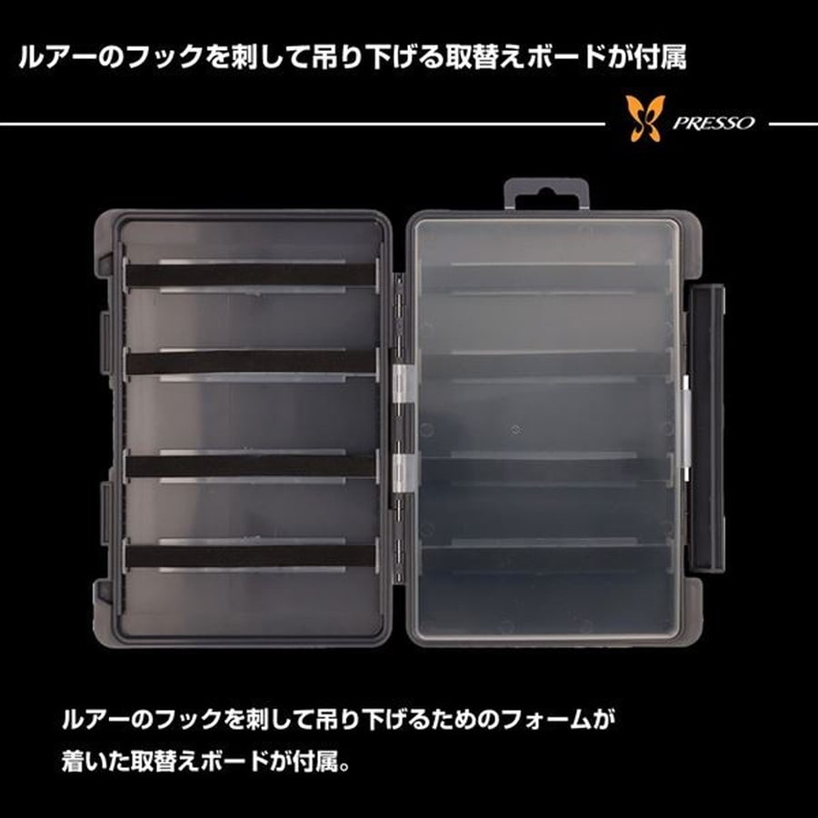 エリアトラウトのスプーン・プラグをすっきり収納できる薄型の両面収納ケース。エリアトラウトで使うスプーンや小型プラグの収納に適した専用ケース。ルアーのフックを刺して吊り下げる取替えボードが付属。取替えボードは使い方に合わせて取り付ける位置を変更可能。観音開きの両面収納構造。ポケットやタックルボックスに余裕を持って入る薄型仕様。フックやルアーどうしの干渉を防ぐパーテーション付き