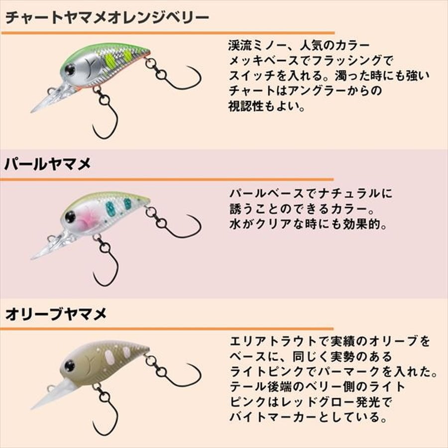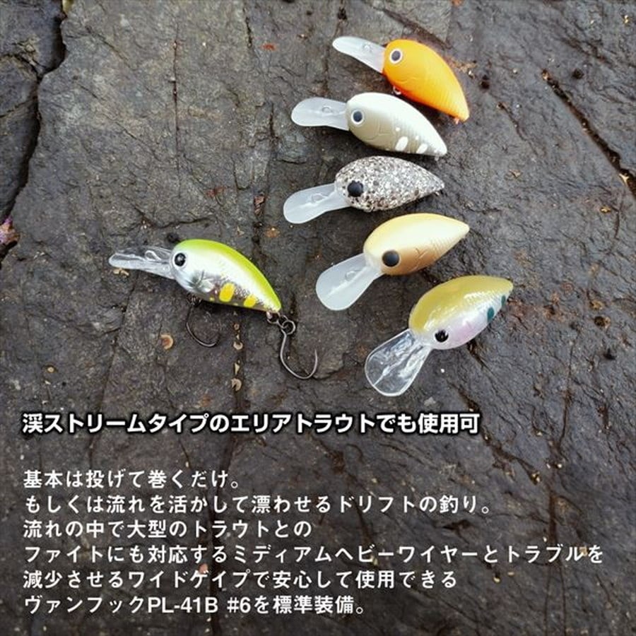 渓流トラウトC&R(キャッチアンドリリース)区間向けにフックと専用カラーでカスタムしたワブクラ30DR。自然渓流の禁漁時期にも渓流トラウトフィッシングを楽しみたいアングラーに向け、C&R(キャッチアンドリリース)区間がある。C&R区間に放流されるトラウトは養殖池で育ったものが多く、川のプール状になっている場所やよどみなど流れの緩いところに付くため、早い流れの中で使う渓流ルアーではなく、スローに誘う事の出来るルアーへの反応が良いためエリアトラウトルアーをC&R区間モデルとしてカスタム。また、C&R区間だけでなくストリームタイプのエリアトラウトもあり、もちろんこちらでの使用も可能。弱ったベイトフィッシュのようなテールを振るワイドウォブリングアクションで基本は投げて巻くだけ。もしくは流れを活かして漂わせるドリフトの釣り。流れの中で大型のトラウトとのファイトにも対応するミディアムヘビーワイヤーとトラブルを減少させるワイドゲイプで安心して使用できるヴァンフックME-41Bを使用★全長:30mm