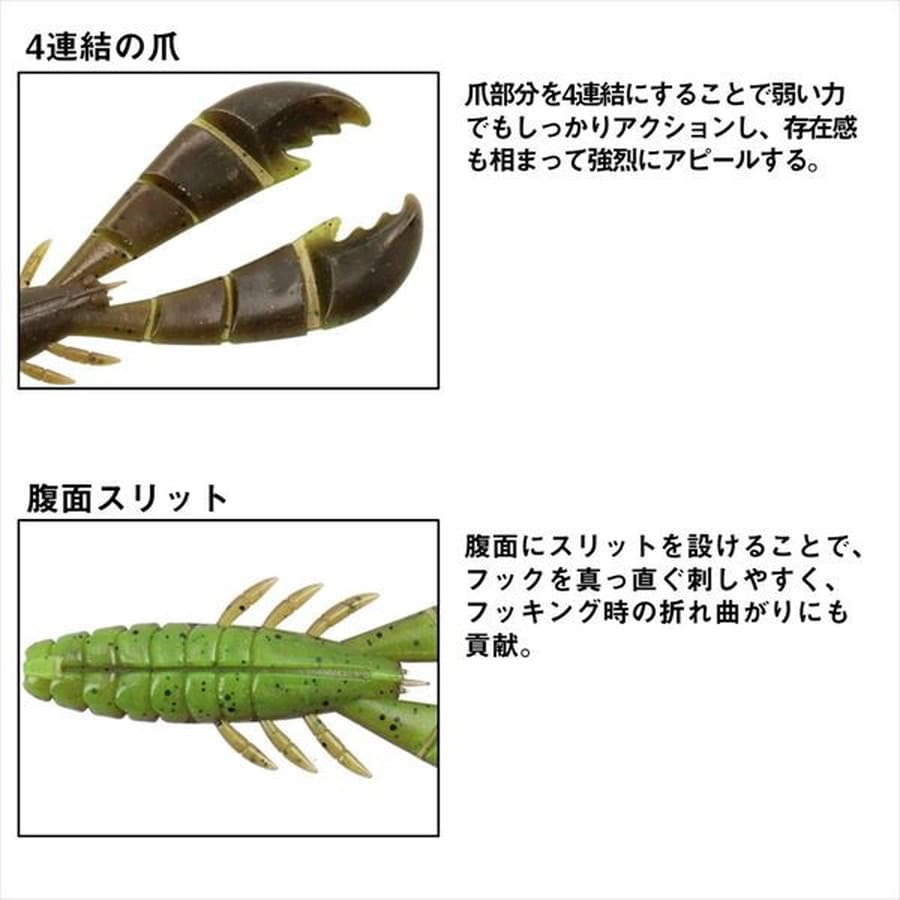 バタバタ動く爪で魚の本能を刺激するハイパワージョイントクローワーム。シャローの近距離戦を得意とするクローワーム。4連結ジョイント構造の爪は、着水直後からアクションを始め、艶めかしくもバタバタ水を強く掻き、魚へ強烈にアピールする。また、ジョイントのおかげで着底からの倒れ込みは爪が遅れて倒れバイトチャンスを誘発させる。大ぶりな爪は、フリップやピッチングの際に振り子の役目を果たし、ストレスなくキャストすることが可能となっている。琵琶湖ガイド 島後英幸監修。4連結ジョイント構造の爪で着水から着底まで常にアピール。爪側にもウエイトがありフリップorピッチングしやすいネイルを刺せばバックスライドにも対応