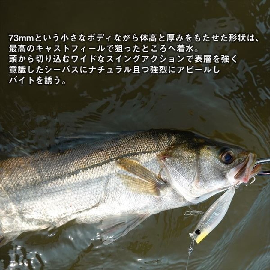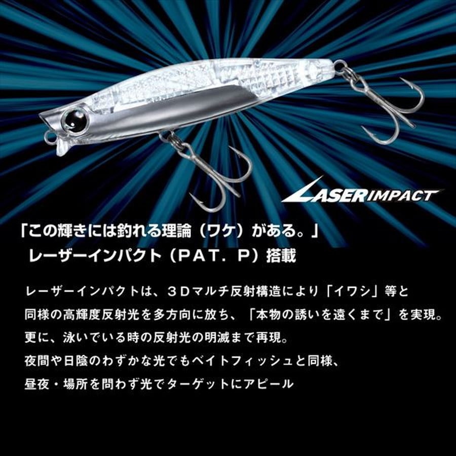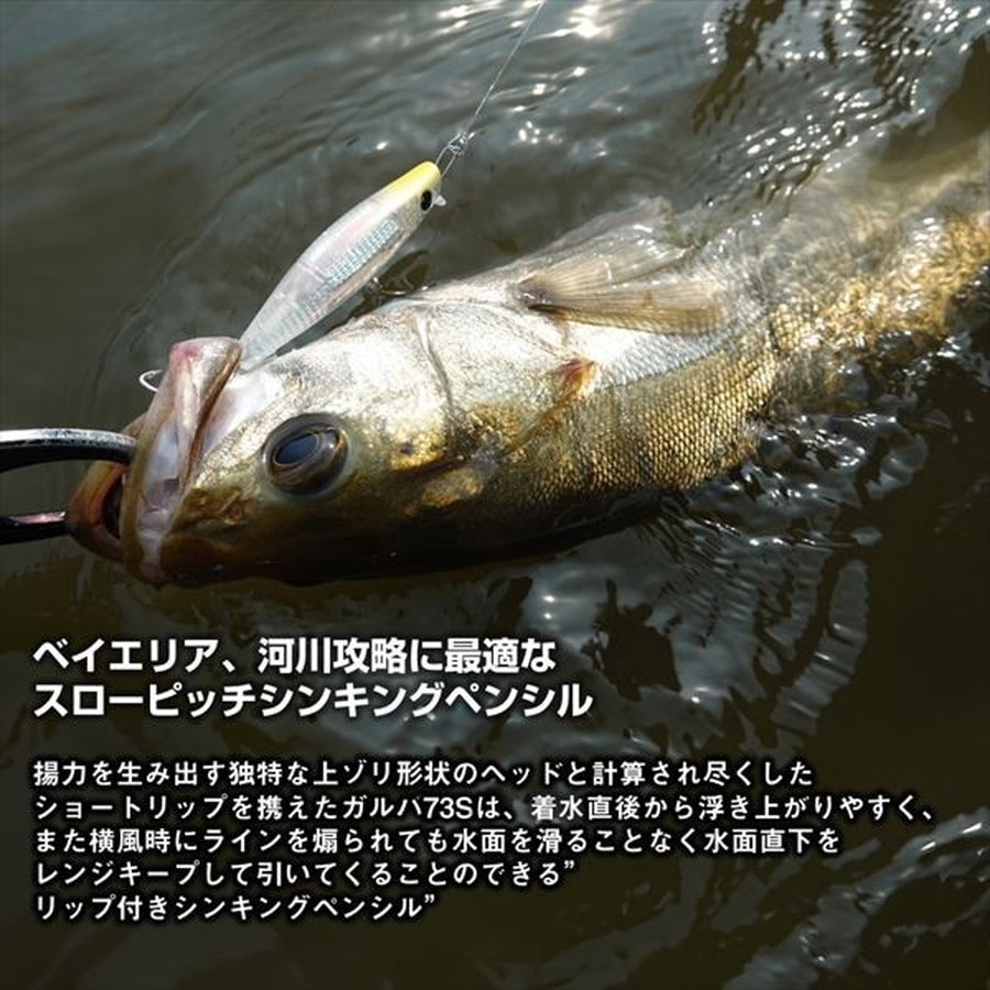 大野ゆうき監修モデル。ベイエリア、河川攻略に最適なスローピッチシンキングペンシル「ガルバ73S」が、レーザーインパクト搭載でブラッシュアップ!レーザーインパクトは、3Dマルチ反射構造により「イワシ」等と同様の高輝度反射光を多方向に放ち、「本物の誘いを遠くまで」を実現。更に、泳いでいる時の反射光の明滅まで再現。夜間や日陰のわずかな光でもベイトフィッシュと同様、昼夜・場所を問わず光でターゲットにアピール。★全長:73mm