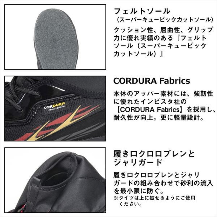 体重の軽い方や丸石フィールドに合うフェルトソールを追加したスペシャルシューズ内部構造を見直し、屈曲性能さらに向上。それにより、岩に対して、更にグリップし、履き心地も向上したF1スペシャルシューズ。柔軟性があるソフトハイカットシューズは、足首が自由になり、高次元の機動性を実現。また、履き口にクロロプレンとジャリガードを搭載することで砂利の流入を最小限に防ぐ(※タイツは上に被せるようにご使用ください。)本体のアッパー素材には、強靭性に優れたインビスタ社の【CORDURA Fabrics】を採用し、軽量かつ耐久性が向上。ダイワスピードフィット・システムを採用し、ワンタッチロックを移動させるだけで靴ヒモ結び不要な仕様(※ヒモとワンタッチロックのパーツがプラスで付属されています。)アウトソールのつま先側にはマッケイ縫製を施し補強することで安全に鮎釣りが可能となった。サイドとカカト上部に入ったスペシャルなデザイン。