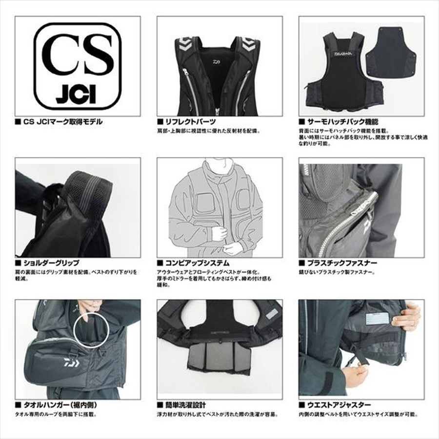磯釣りに特化した多機能で、ハードな環境にも対応する強靭かつ軽量な磯フロートベストが登場。設計を見直し軽量化を実現。長時間の実釣時の負担を軽減。スマートフォン落下防止機能を新設。ロッド操作の操作性を考慮し肩甲骨の可動域を妨げない背面カッティング。最近の大型スマートフォンが収納可能な中央ファスナーポケット(ケースサイズにより入らない場合もあります)。ご好評の取り外し式のサーモハッチバック機能。取り外し式の為刺繍やプリントの加工がしやすくなる。海水や潮風からくる錆びを予防するため、ピンオンリールをポケットの中に入れたまま取り付けパーツ先を出すことが可能な出し口を胸ポケット底に新設。腰前ポケット中心側の入れ口はサシエボックスを取り付けることが可能。中心タブと合わせて同時に2個取り付けができる。ピンタイプ、クリップタイプ、カラビナタイプのピンオンリールの装着が可能なDカンを採用