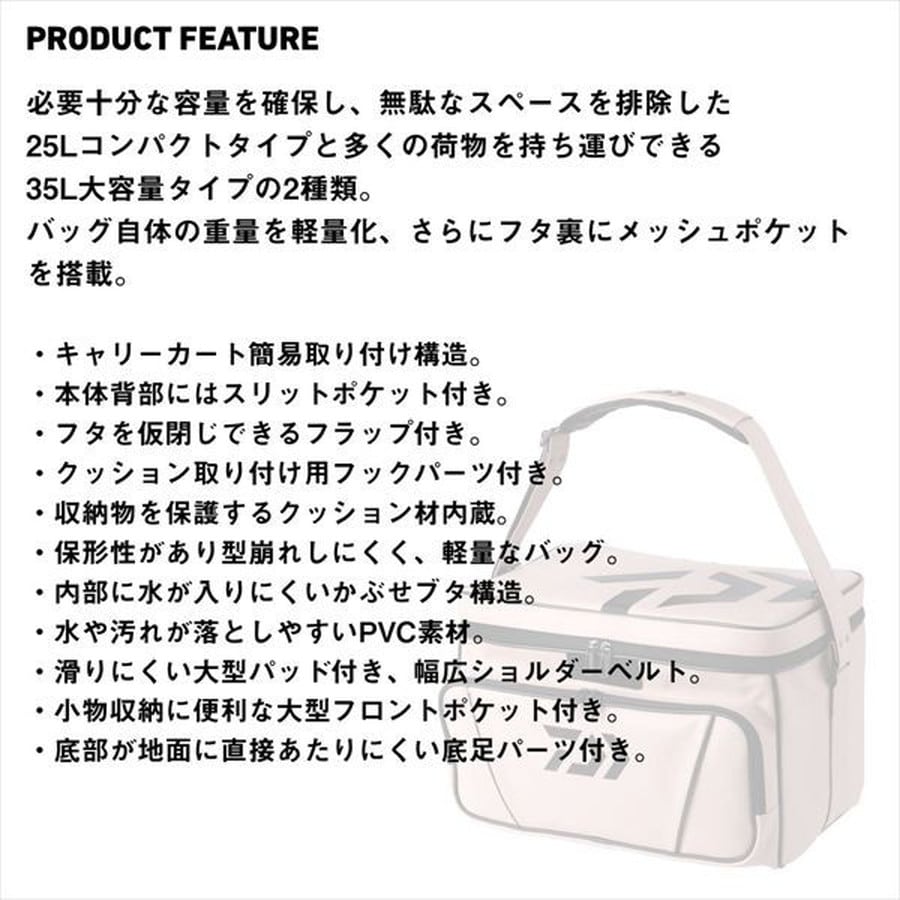 持ち運びやすい軽量タイプのへらバッグ!バッグ自体の重量を軽量化、さらにフタ裏にメッシュポケットを搭載してアップデートして新登場!◆必要十分な容量を確保し、無駄なスペースを排除した25Lコンパクトタイプと多くの荷物を持ち運びできる35L大容量タイプの2種類 ◆フタ裏に小物を分けて収納するのに便利なメッシュポケット付き ◆キャリーカート簡易取り付け構造 。背面のスリットポケットは玉網やフラシ、シート等の収納にも便利。◆フタを仮閉じできるフラップ付き ◆クッション取り付け用フックパーツ付き ◆収納物を保護するクッション材内蔵 ◆保形性があり型崩れしにくく、軽量なバッグ ◆内部に水が入りにくいかぶせブタ構造 ◆水や汚れが落としやすいPVC素材 ◆滑りにくい大型パッド付き、幅広ショルダーベルト ◆小物収納に便利な大型フロントポケット付き ◆底部が地面に直接あたりにくい底足パーツ付き