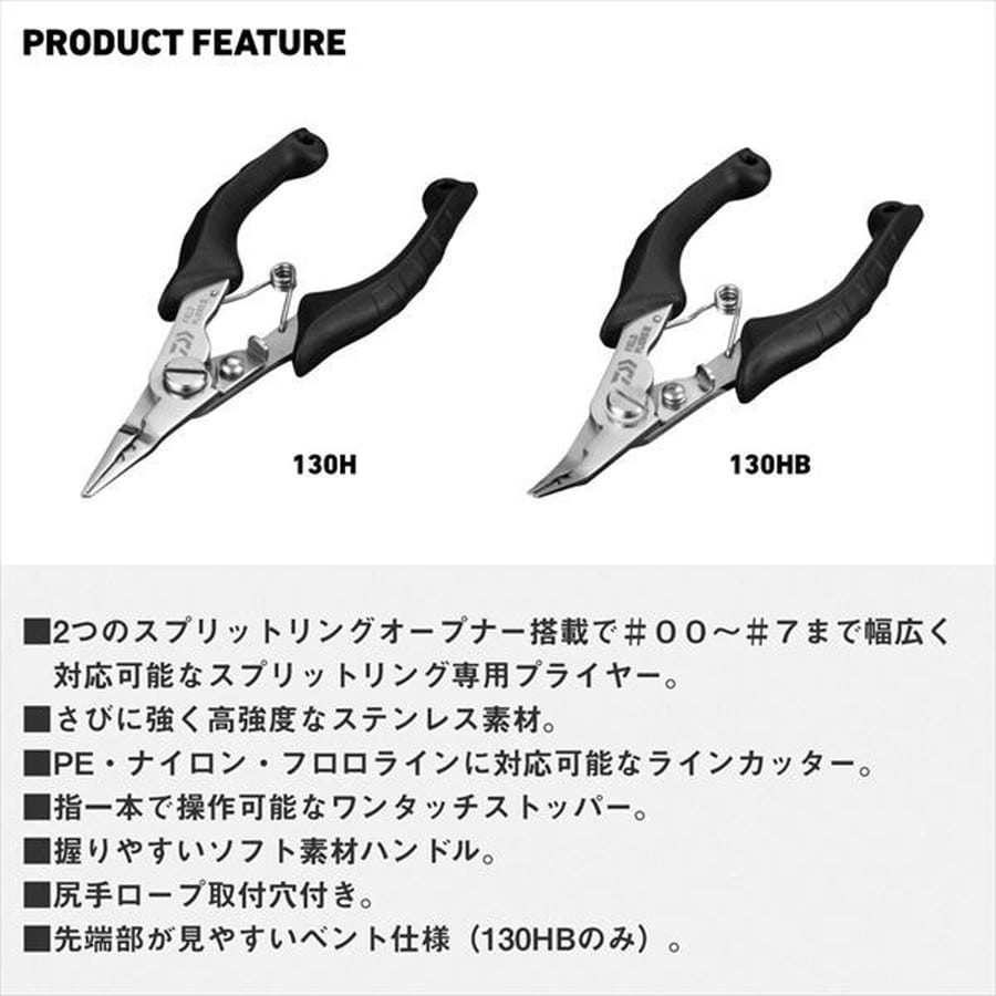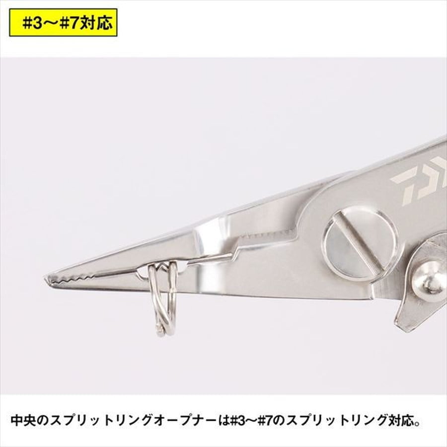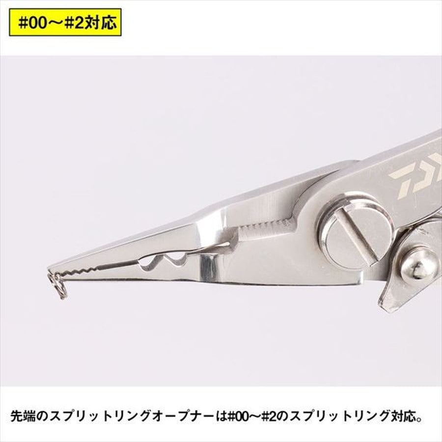 2つのスプリットリングオープナーで#00~#7まで幅広く対応可能なスプリットリング専用プライヤー。さびに強く高強度なステンレス素材。PE・ナイロン・フロロラインに対応可能なラインカッター。指一本で操作可能なワンタッチストッパー。握りやすいソフト素材ハンドル。尻手ロープ取付穴付き。