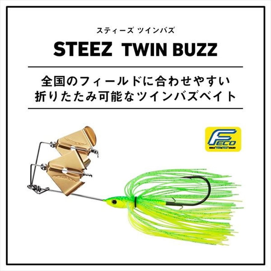 全国のフィールドに合わせやすい折りたたみ可能なツインバズベイト!アルミペラを2枚搭載したバズベイト。特徴的な形状ながら、ツインペラによる恩恵は非常に大きい。通常バズベイトは着水からある程度リトリーブしないと水面までペラが上がってこず、一番バイトが期待できる着水直後のアクションを出しにくい。スティーズ ツインバズはペラが2枚あることで着水後すぐに急浮上しアクションを開始するため、バイトチャンスを逃さない。ペラが2枚付いていることで、姿勢安定にも貢献。高速リトリーブでもルアーが傾かずに泳ぎ切ることが出来る。また、バズベイトとは思えない飛距離を出せるのも、ツインバズの魅力だ。広範囲を探る釣りにおいて、大きなアドバンテージとなっている。スティーズ ツインバズはウエイトを1/4ozクラスとし、折りたためる構造を採用した。ペラ側のワイヤーをつまんでたたむことで、ケース内でかさばらず、ライトなタックルでルアーやタックルを絞りたい陸っぱりの釣りでも重宝出来る。是非、スティーズ ツインバズの威力を体感してほしい。