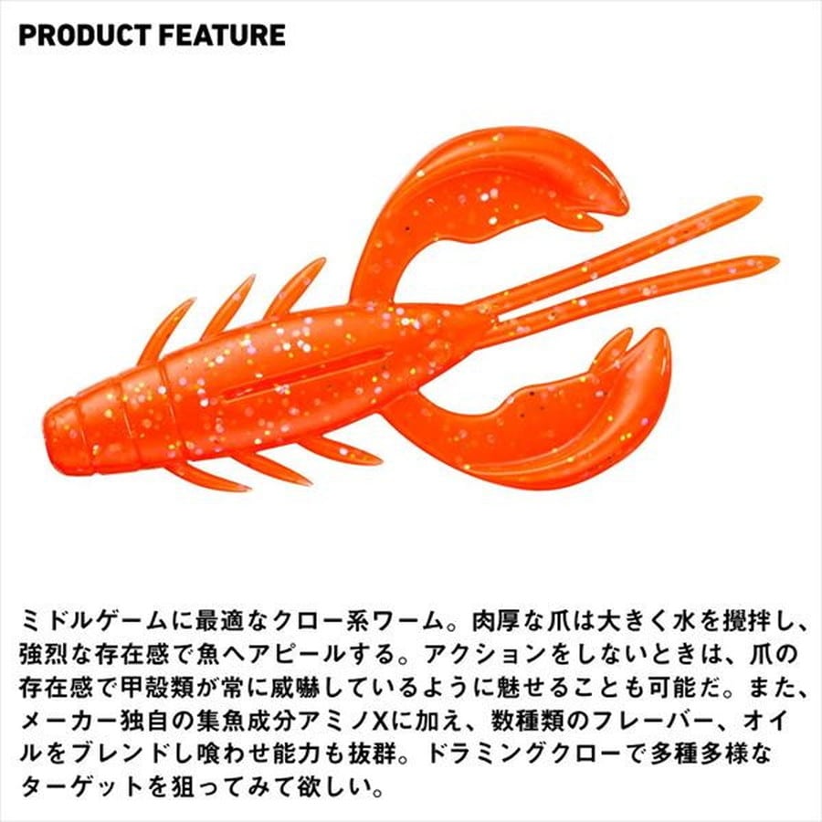ミドルゲームに最適!存在感抜群のハイパワークローアクション!ミドルゲームに最適なクロー系ワーム。肉厚な爪は大きく水を攪拌し、強烈な存在感で魚へアピールする。アクションをしないときは、爪の存在感で甲殻類が常に威嚇しているように魅せることも可能だ。また、ダイワ独自の集魚成分アミノXに加え、数種類のフレーバー、オイルをブレンドし喰わせ能力も抜群。ドラミングクローで多種多様なターゲットを狙ってみて欲しい。★全長:2.4inch
