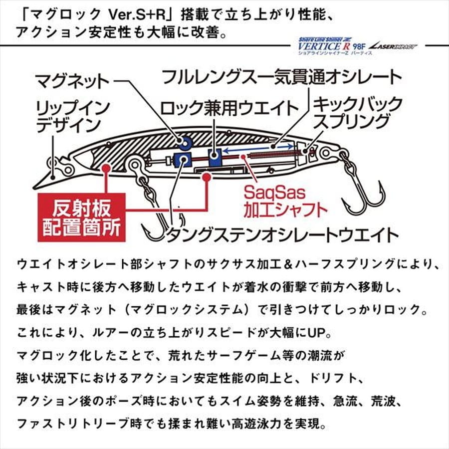 飛びの伝説を引き継いだSLZバーティスRに、レーザーインパクト搭載モデルが登場!「この輝きには釣れる理論(ワケ)がある。」レーザーインパクト(PAT P)搭載。レーザーインパクトは、3Dマルチ反射構造により「イワシ」等と同じ高輝度反射光を多方向に放ち、「本物の誘いを遠くまで」を実現。更に、泳いでいる時の反射光の明滅まで再現!夜間や日陰のわずかな光でもベイトフィッシュと同様、昼夜、場所を問わず光でターゲットにアピール。■98F・・・河川、河口、港湾部をメインフィールドに想定したコンパクトサイズフローティングミノー★全長:98mm