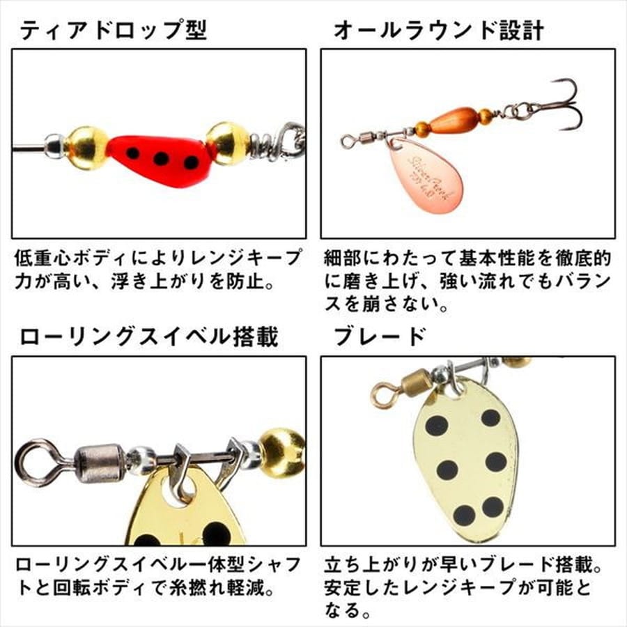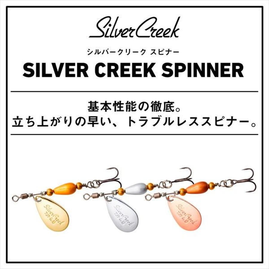 基本性能の徹底。立ち上がりの早い、トラブルレススピナー。スピナーは「投げて巻く」、これだけでとにかく釣れる。シンプルであるがゆえに、ルアーの基本性能は誤魔化しがきかず大切になる。シルバークリークスピナーはこの基本性能を徹底的に見直した。細部にわたって基本性能を徹底的に磨き上げ、強い流れでもバランスを崩さないオールラウンド設計。ローリングスイベル一体型シャフトと中通しの回転するボディにより糸ヨレ軽減。★重量(g):6