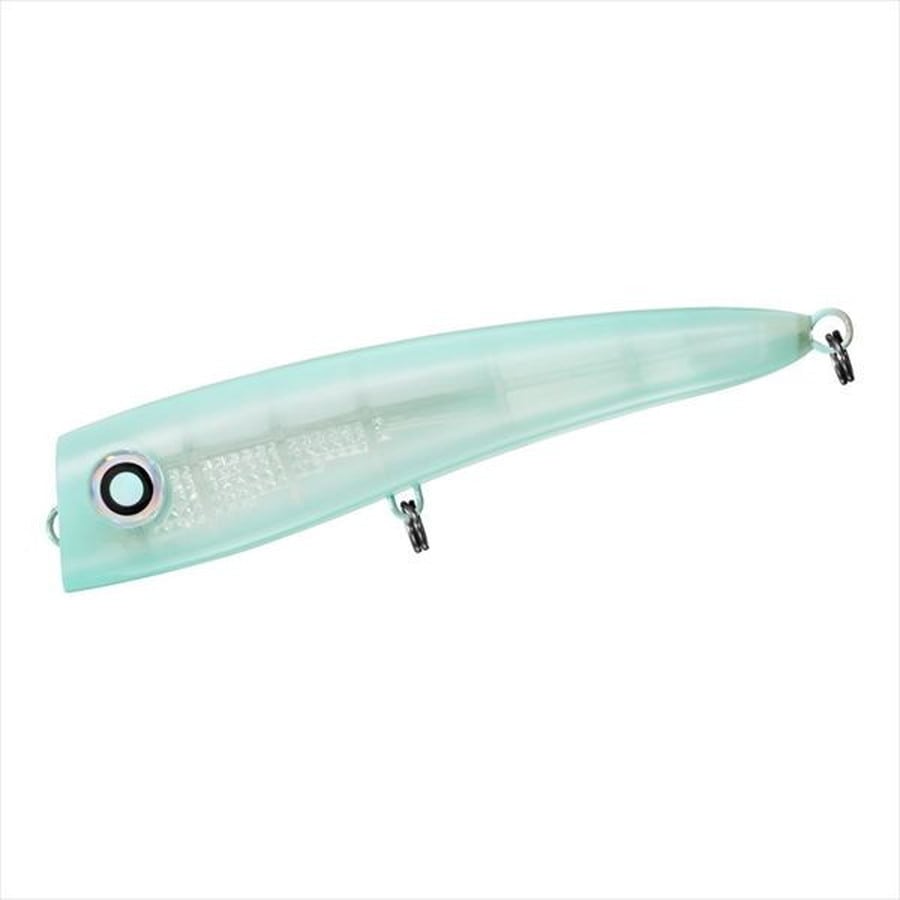 魅惑サウンド×超バブル。湧き上がる熱狂を。ソルティガフロッサーはきめ細やかな泡を纏い、魅惑のポップサウンドを奏でながら水中の魚を魅了するポッパーである。カップ上部は泡を噛みやすい様、深めに設定し、下部は浅くし、泡をたてられるような形状とした。それにより、リトリーブ時に深く潜りすぎず、水面直下を細かな泡と共に泳ぐ。また、ポッパーは高浮力タイプが多く、浮力を保つために沢山のウエイトを積めないが、ソルティガフロッサーはギリギリまでウエイトを積み、また、横風を受けた時にバランスを崩しにくいフォルムで飛行姿勢を安定させ、飛距離のアドバンテージを確保した。水中での浮き姿勢は垂直浮きで、一回目のジャークで潜りすぎず、レスポンスもよくなる。直線的でレスポンスの良いポッパーなので、リズミカルにテンポよく、まるでダイビングペンシルを扱えるポッパーである。