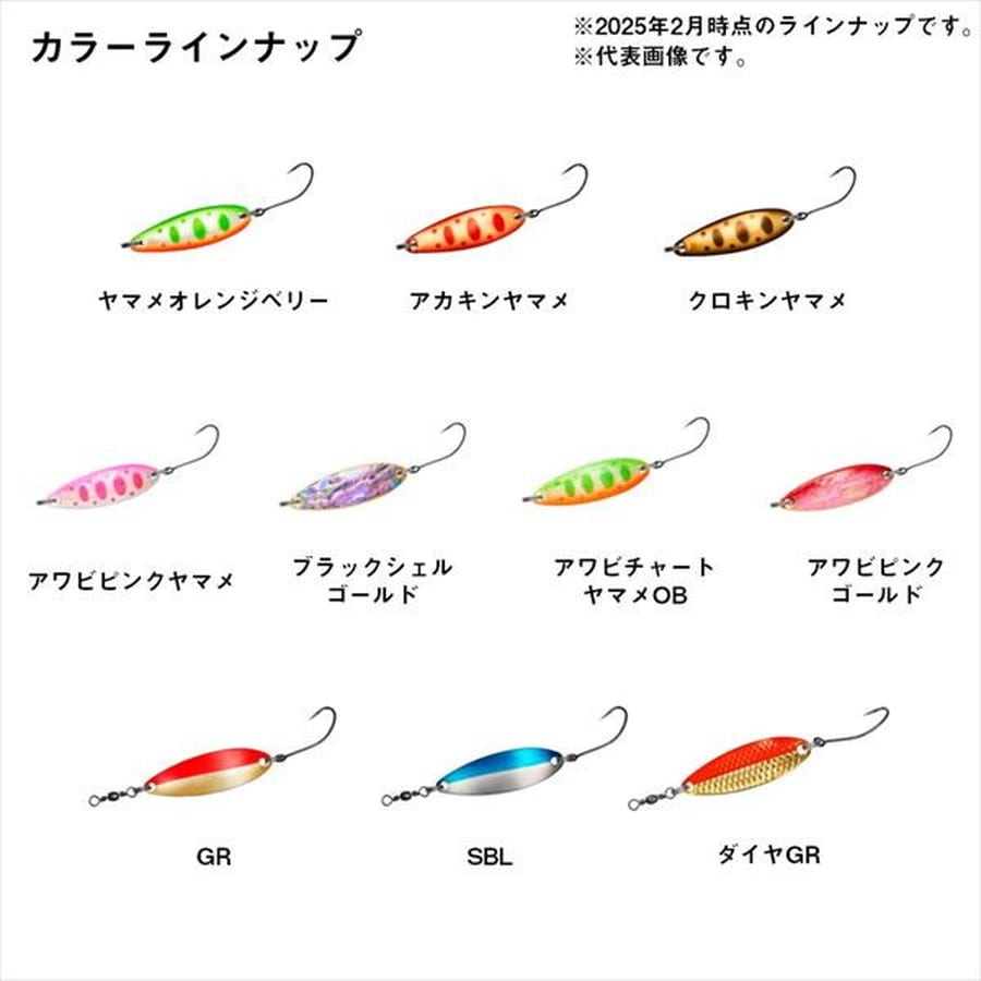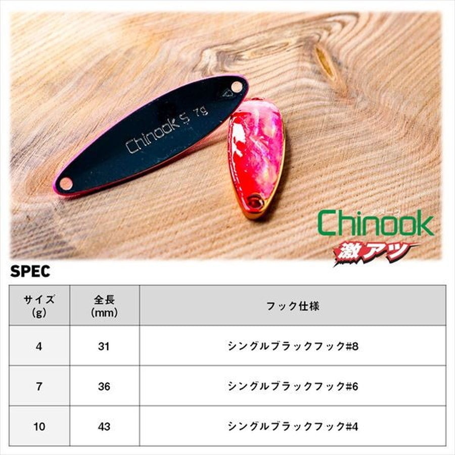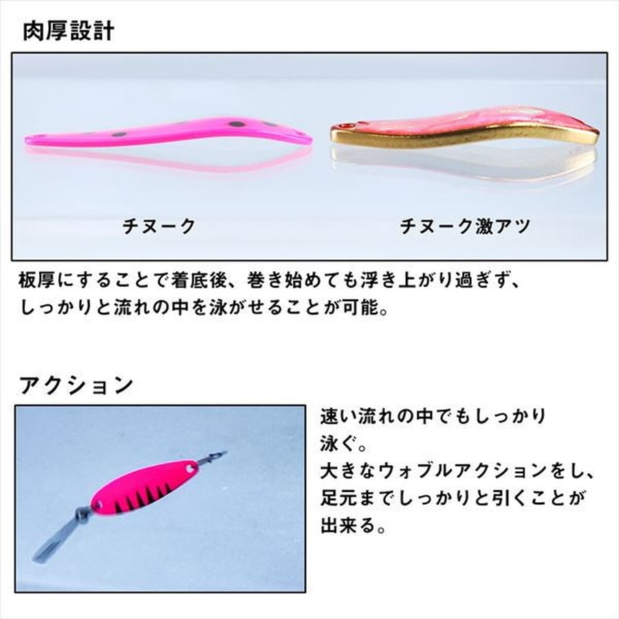 流れをとらえ、しっかり泳ぐ!速い流れの中でしっかり底を取ることが出来る。着底後、巻き始めても浮き上がり過ぎず、しっかりと流れの中を泳がせることが可能。特に流れの速い中規模河川での出番が多くなるスプーン。止水での使用ももちろん可能で、大きなウォブルアクションをし、足元までしっかりと引くことが出来る。★重量(g):7
