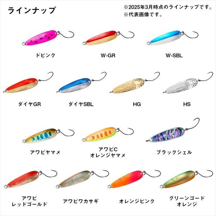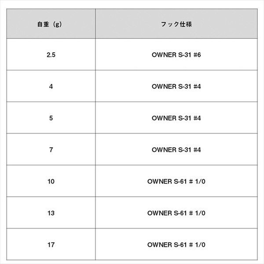 長い歴史を経て、今なお色褪せない実力を発揮するスプーンの代名詞。ネイティブトラウト狙いに欠かせない定番スプーン。数々のテストを経て「釣れるカラー」を厳選。長さと幅の好バランス、適度な肉厚を備えた形状は実にスタンダードなシェイプでクラシックタイプとも呼ばれる。特にテールのカップが深いため、流れをよくつかむことができ、非常に大きなアクションを発生させる。止水~河川のほぼあらゆるシチュエーションに対応。10g、13g、17gには、サクラマスを中心としたビッグトラウトを狙うアングラーを対象にボトムトレースでも根掛かりしにくいフォルム、ホールドの良いゲイプフォルム、アイ方向に向いたカッティングポイントがしっかりしたフッキングを行うOWNER S-61シングルフック仕様をラインナップ。★重量(g):2.5
