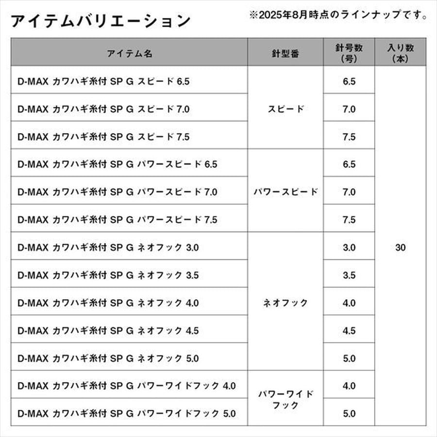 スペシャルフィニッシュに金針が登場。カワハギ針として定番の金針を採用し、DAIWA独自のスペシャルフィニッシュ加工を施した。滑り性を付与することで刺さりも良くなり、金針のアピール力も兼ね備えた糸付針。ハリスは信頼のDフロン船ハリスを使用し、長さ8㎝のコブ付。小分けされた10本×3袋で保存や取り出しも便利。針はスピード/パワースピード/ネオフック/パワーワイドフックの4種類をご用意。