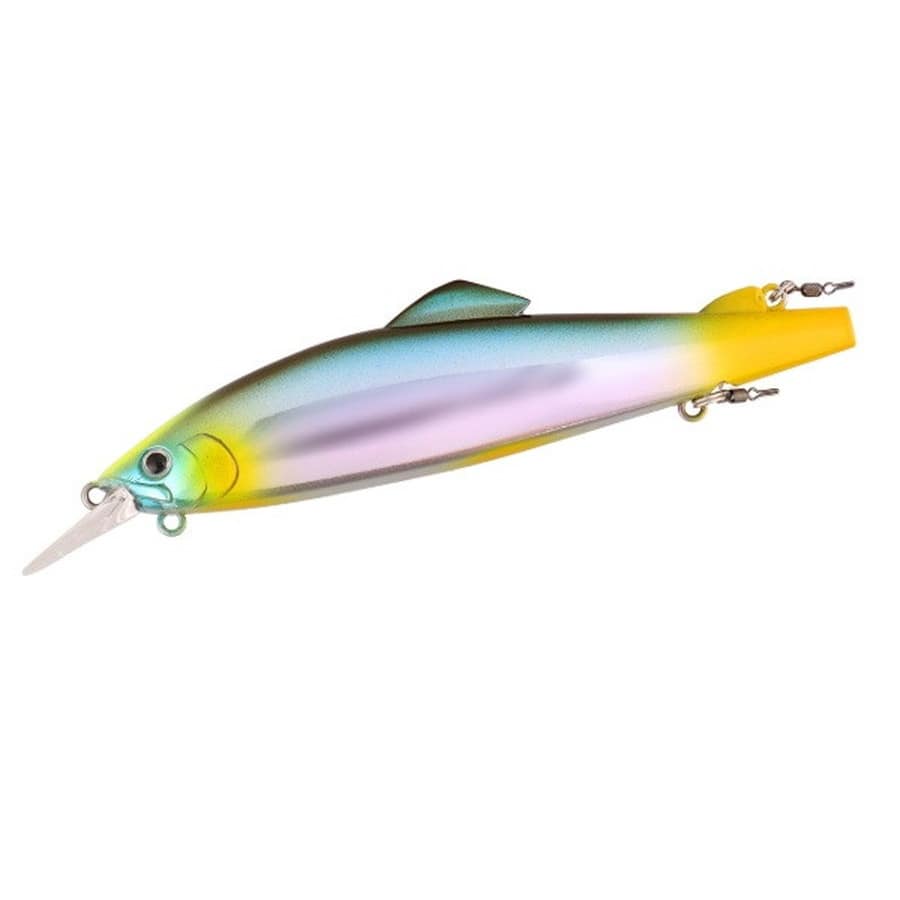 浅場攻略の切り札!AYUINGミノーフラット110SFはフラットサイドボディで、アユが苔をはむ様な独自のヒラウチアクションをする。また、ショートワイドリップが水の流れが緩いポイントでもしっかりと水を掴み、今までAYUINGが苦手としていた、浅場の緩い流れの攻略に適したルアーとなっている。AYUINGミノーフラット110SFには2つのフックアイがある。一つ目は腹部にあるフックアイ。今まではこのアイだけであったが、新たに背面後方部のアブラビレの後ろのポジションにフックアイを設定した。友釣りでは浅場を攻略をする際、逆さバリをアブラビレに刺し、根掛りリスクを減らす釣り方があり、その様な釣り方からヒントを得たのが背面後方部のフックアイである。そして、腹部後方のフックアイの後ろにはマグネットが埋め込まれており、スプリットリングを固定し、イカリをまっすぐ後方へ垂らす働きをする。リップ裏にもアイが付いており、こちらはシンカーなどを装着し、チューン出来るようになっている。