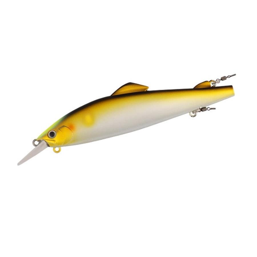浅場攻略の切り札!AYUINGミノーフラット110SFはフラットサイドボディで、アユが苔をはむ様な独自のヒラウチアクションをする。また、ショートワイドリップが水の流れが緩いポイントでもしっかりと水を掴み、今までAYUINGが苦手としていた、浅場の緩い流れの攻略に適したルアーとなっている。AYUINGミノーフラット110SFには2つのフックアイがある。一つ目は腹部にあるフックアイ。今まではこのアイだけであったが、新たに背面後方部のアブラビレの後ろのポジションにフックアイを設定した。友釣りでは浅場を攻略をする際、逆さバリをアブラビレに刺し、根掛りリスクを減らす釣り方があり、その様な釣り方からヒントを得たのが背面後方部のフックアイである。そして、腹部後方のフックアイの後ろにはマグネットが埋め込まれており、スプリットリングを固定し、イカリをまっすぐ後方へ垂らす働きをする。リップ裏にもアイが付いており、こちらはシンカーなどを装着し、チューン出来るようになっている。